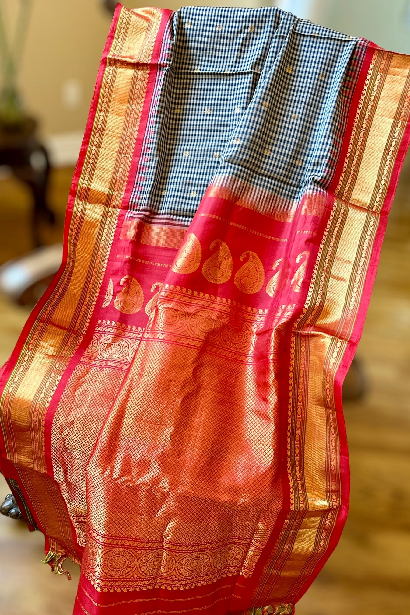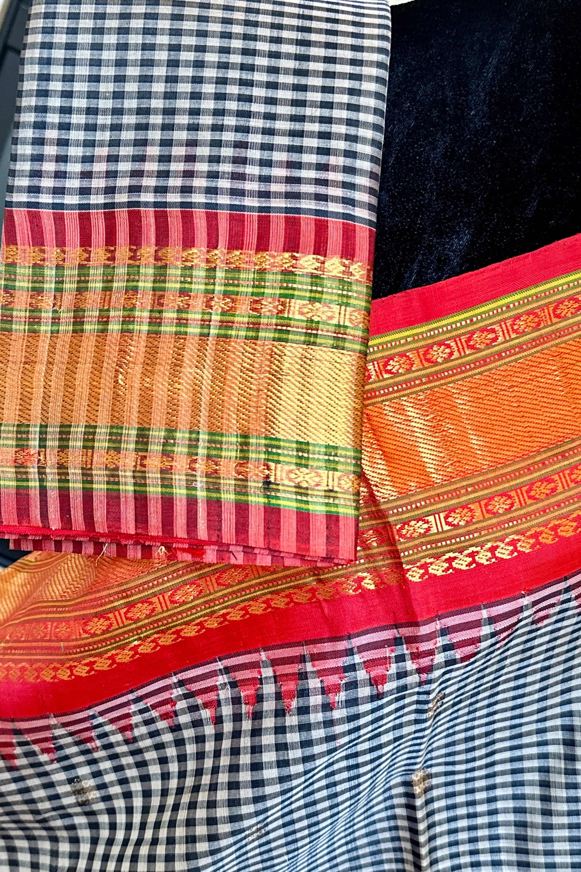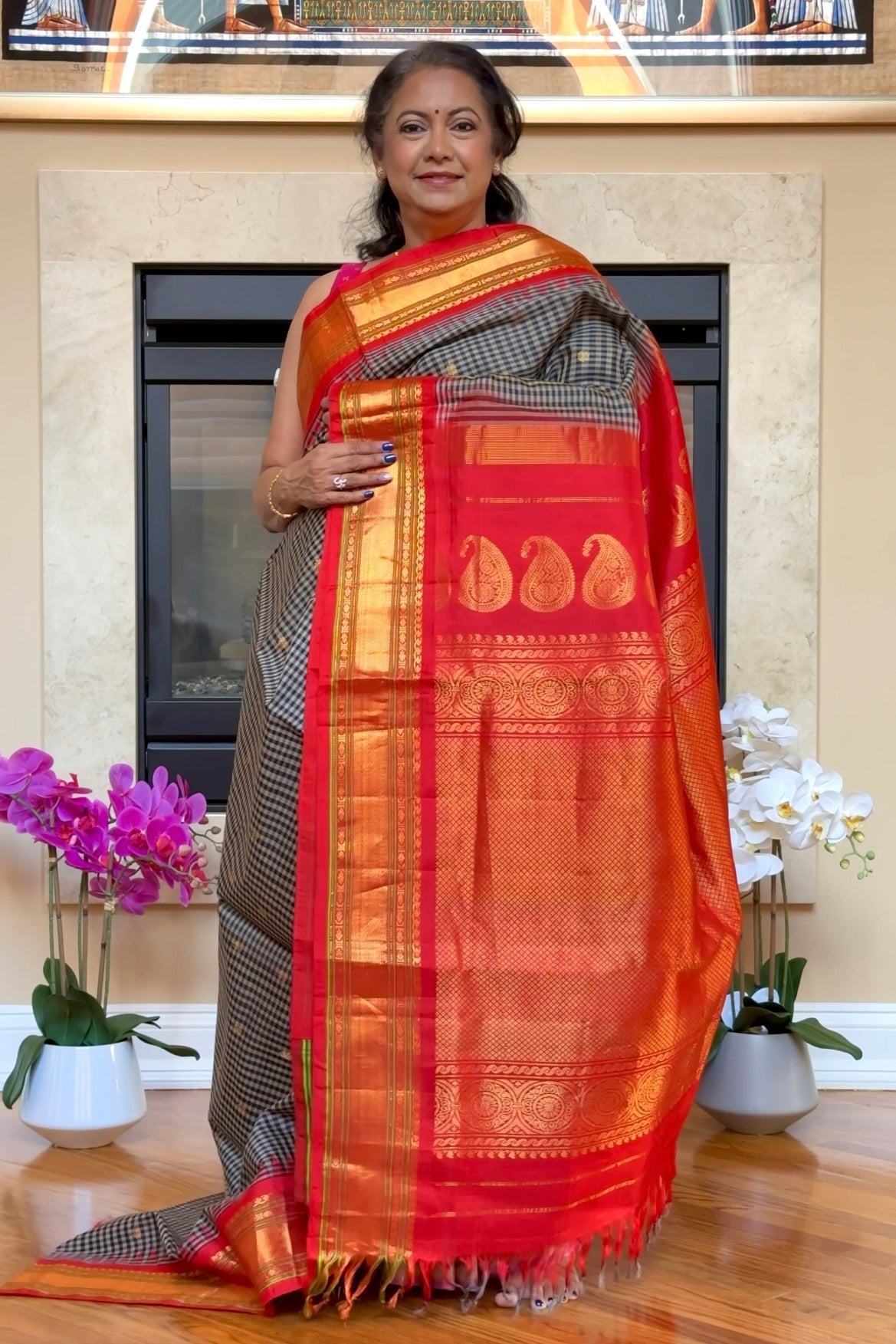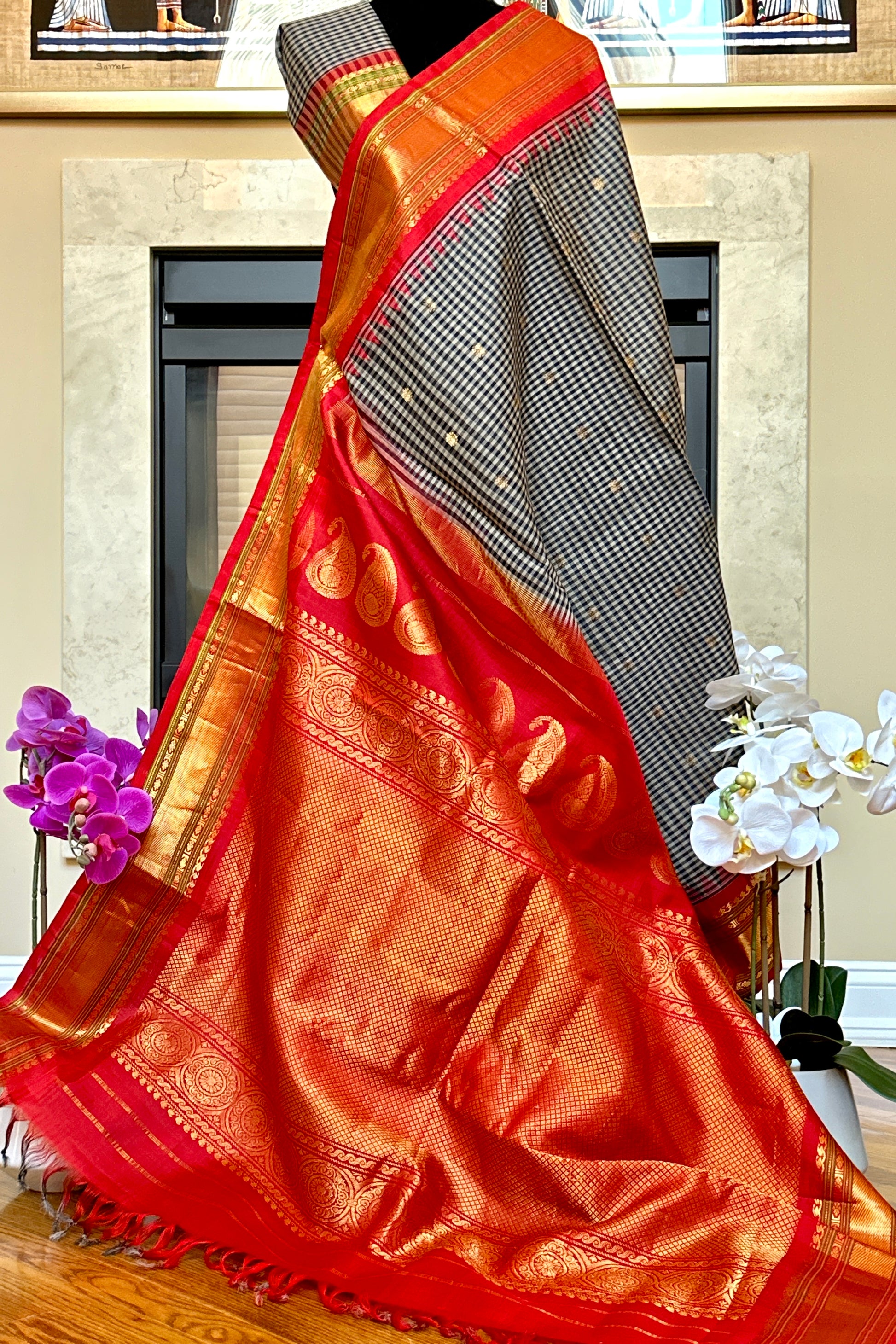 This stunning gadwal SICO (silk cotton) saree in black and white checks is handwoven with a silk warp and cotton weft on the body. The korvai borders in red have traditional designs in gold zari. The grand pallu mirrors the colors of the borders with traditional patterns in gold zari. Gadwal SICO sarees come with the borders and pallu in silk.
