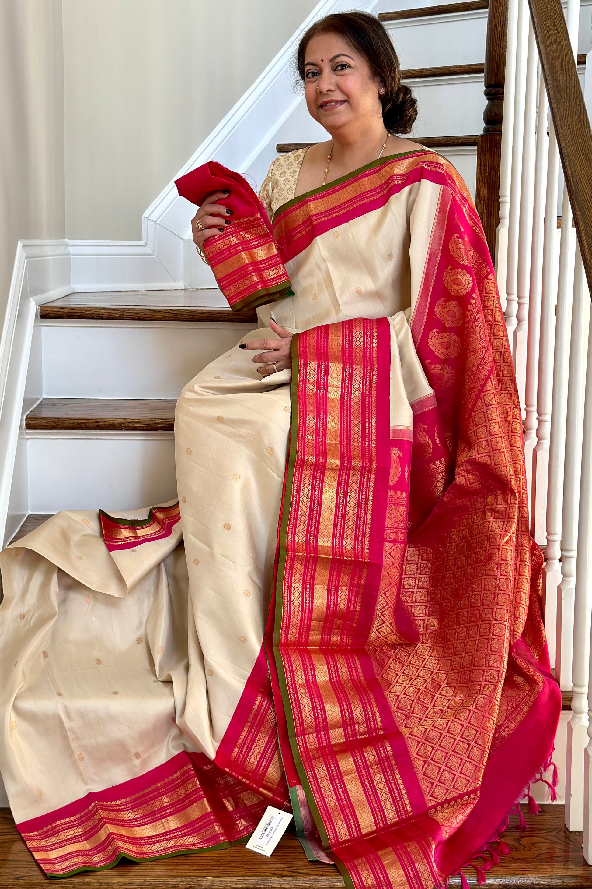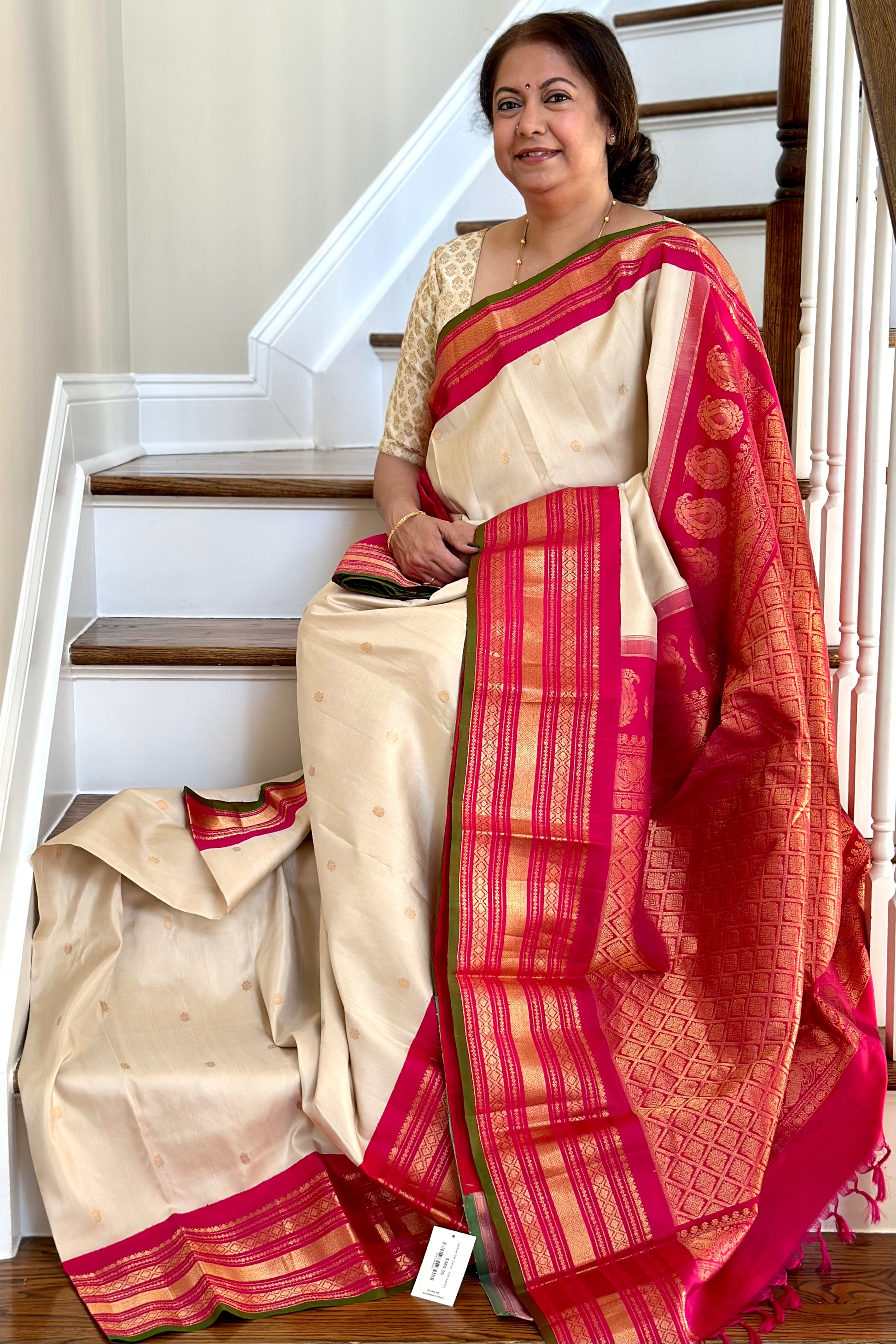 This beautiful korvai gadwal silk saree tussar white color with magenta pink color border is handwoven. The body is adorned with floral and chakra motifs in gold zari. The borders have lattice and geometrical motifs in gold zari while the pallu is adorned with heavy zari work along with paisley, lattice and floral motifs. The blouse is magenta pink in color.