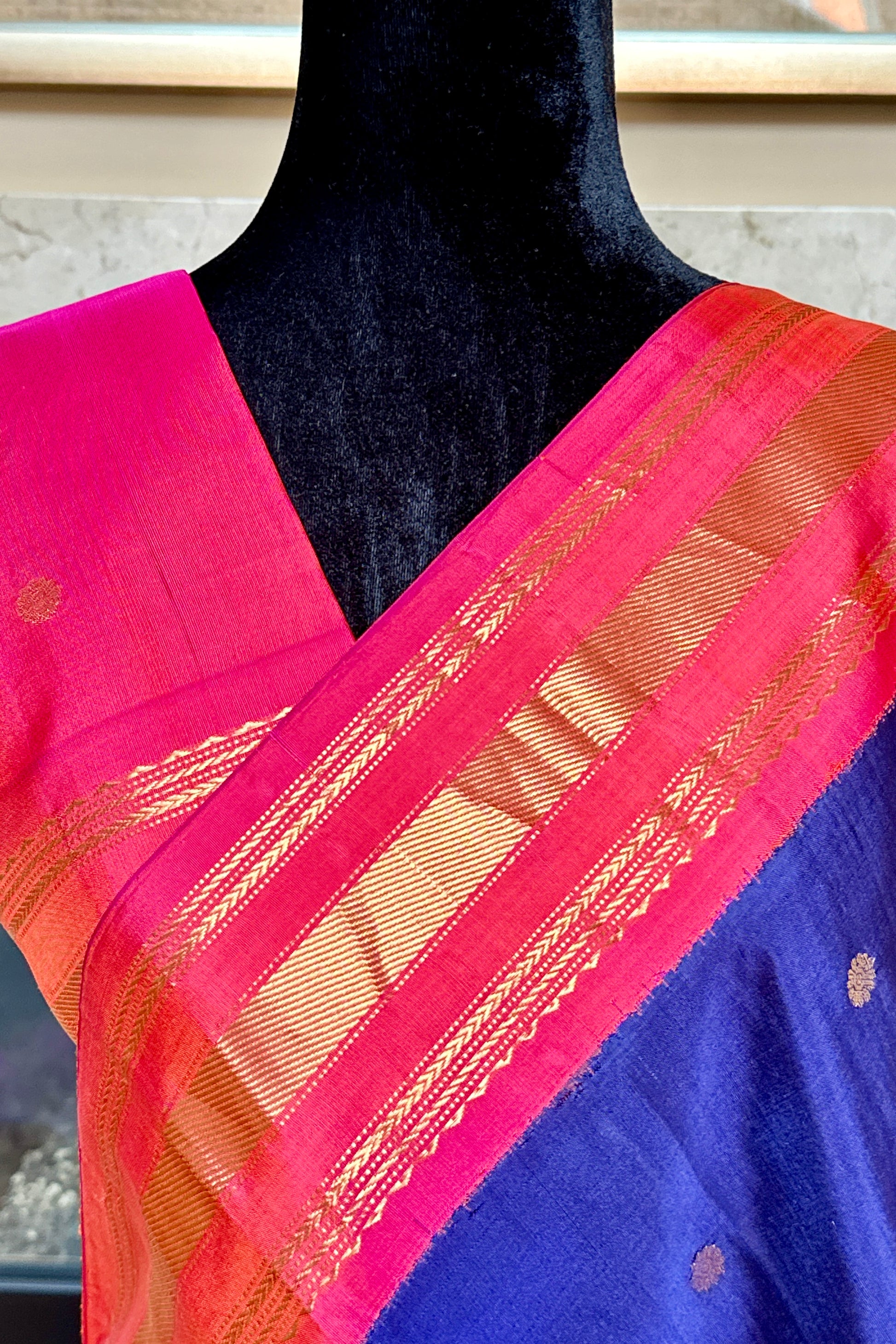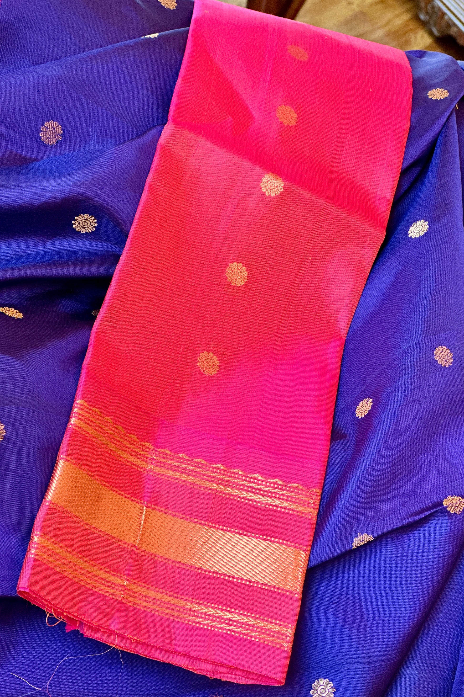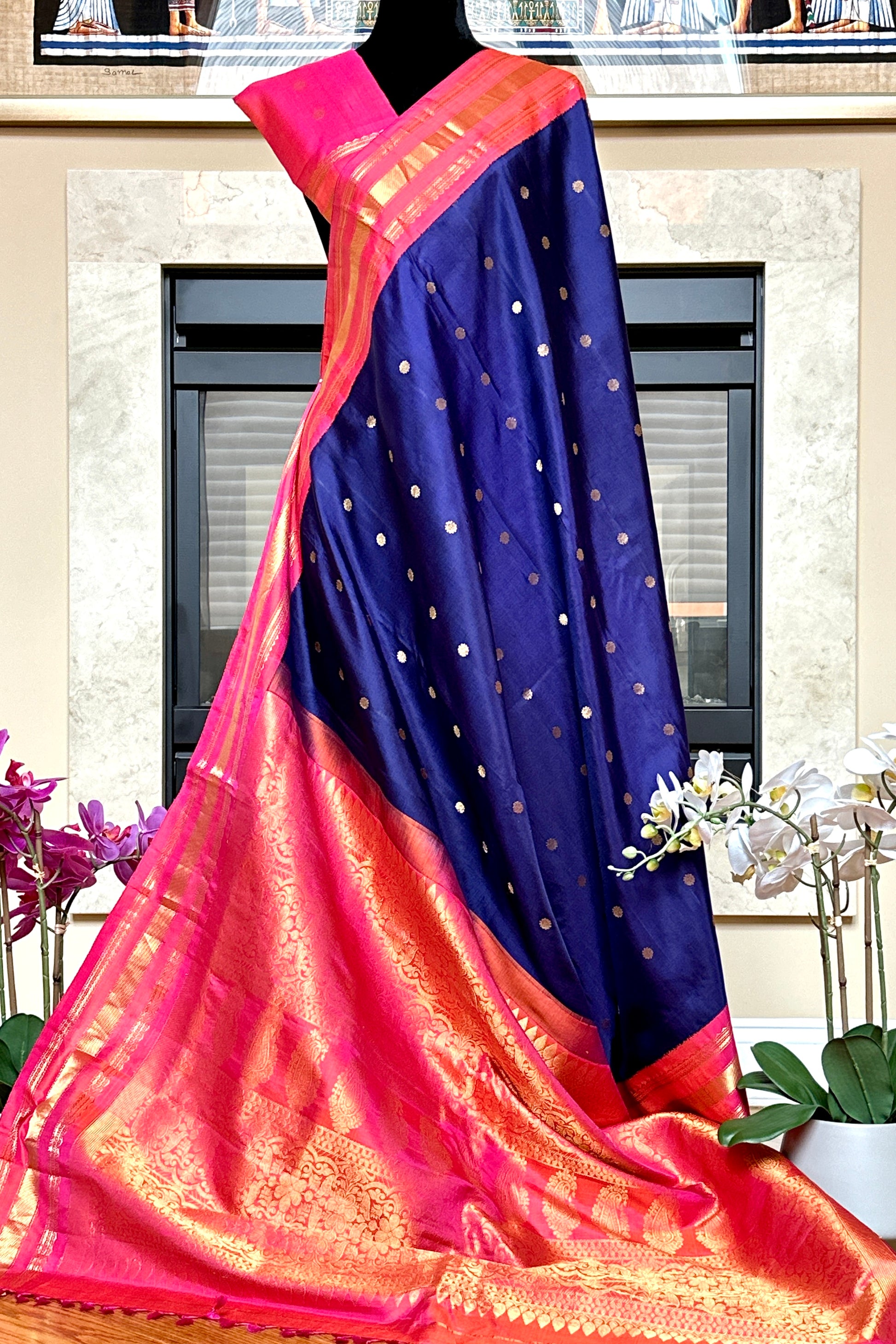 This beautiful Gadwal Silk Saree is a classic handwoven piece crafted using the finest silk. Show off your style in this elegant saree, featuring navy blue with buttis on the body while the kuttu borders and the grand pallu in two tone pink. The matching blouse piece is in two tone pink. Perfect for any special occasion, you'll love the quality and finish of this gadwal saree.