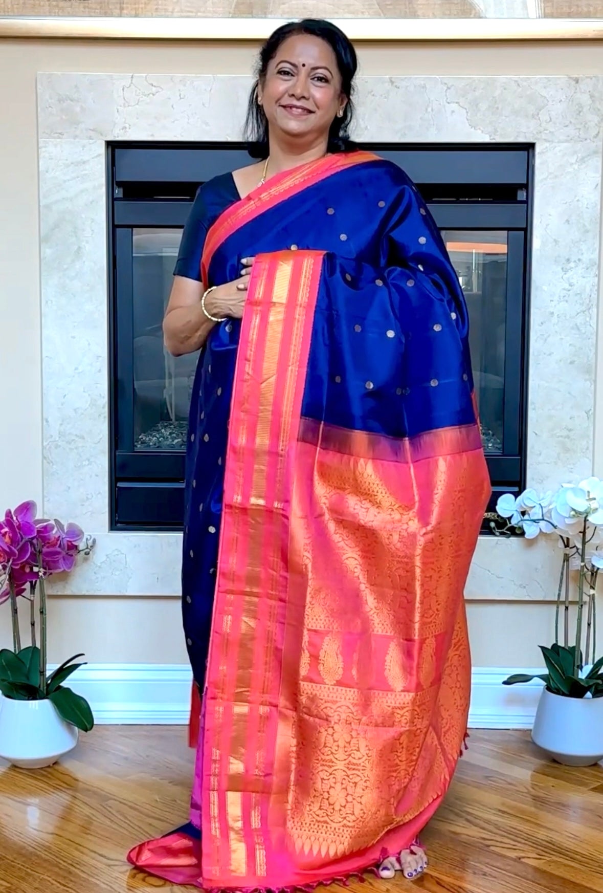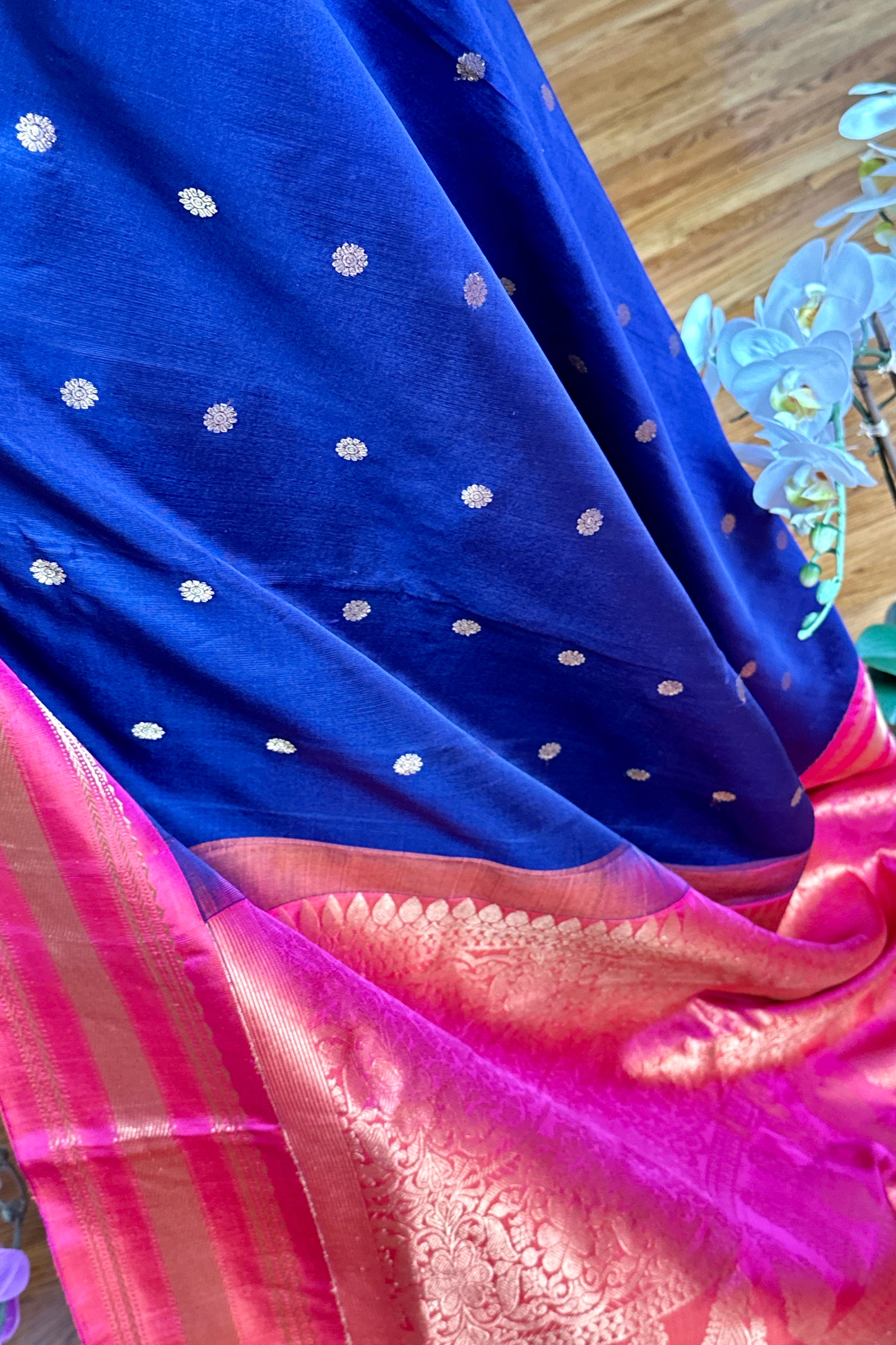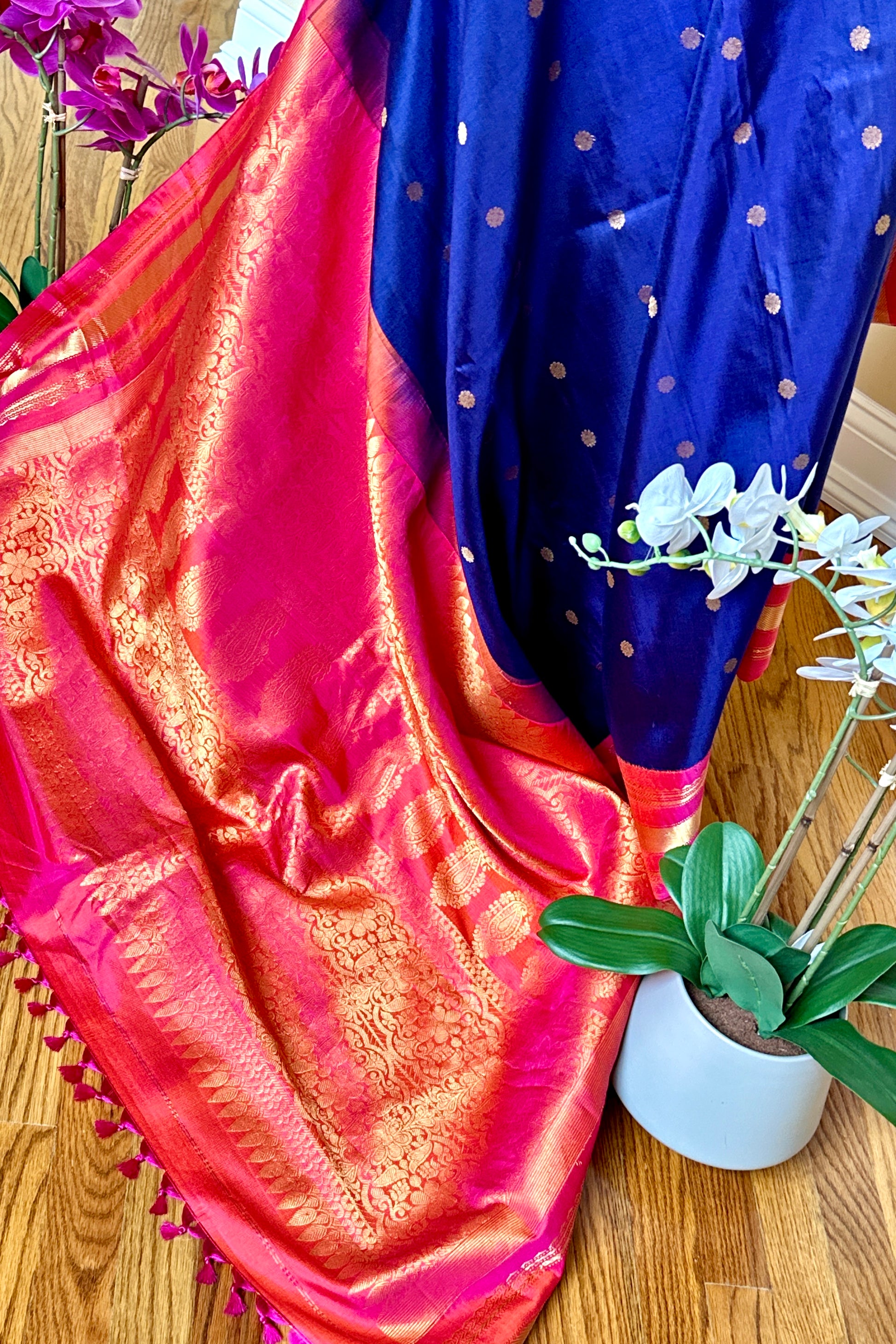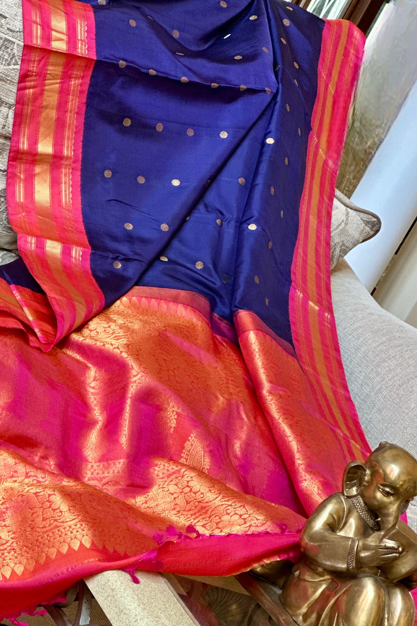 This beautiful Gadwal Silk Saree is a classic handwoven piece crafted using the finest silk. Show off your style in this elegant saree, featuring navy blue with buttis on the body while the kuttu borders and the grand pallu in two tone pink. The matching blouse piece is in two tone pink. Perfect for any special occasion, you'll love the quality and finish of this gadwal saree.