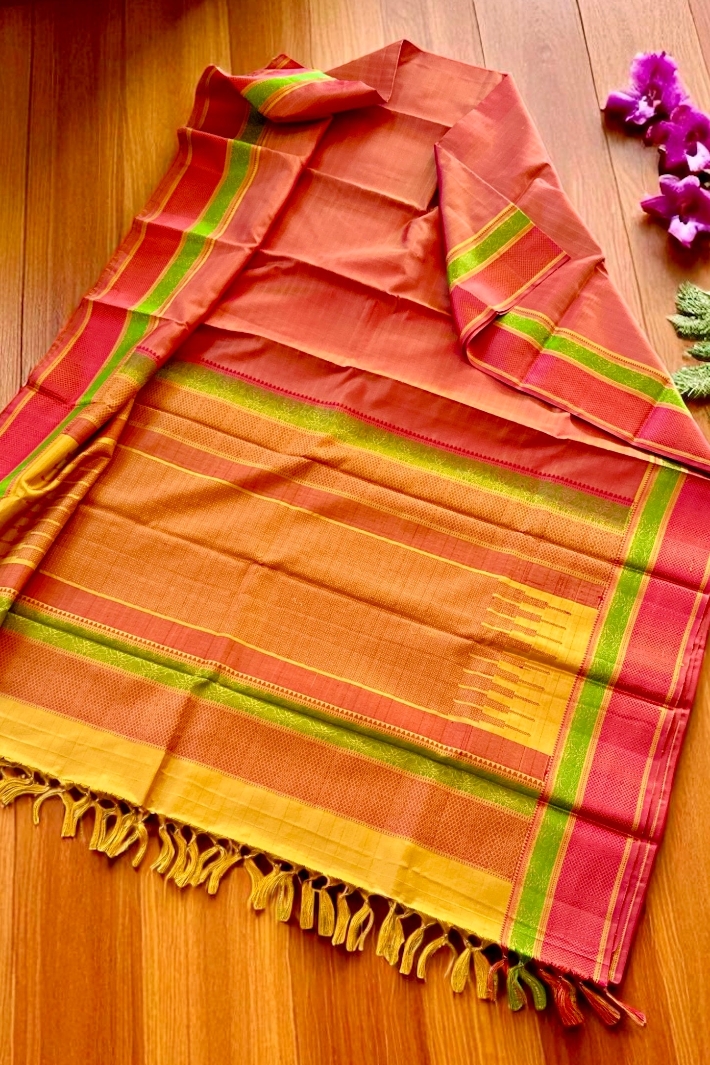 This beautiful soft silk saree in a dual shade of orange is handwoven with horizontal self stripes running along the body. The borders in orange shot with yellow have diamond and gandaberunda motifs in green and red. The pallu mirroring the patterns of the borders, also features a geometric pattern and bands in red and golden yellow. The blouse piece is in golden yellow with peacock and yazhi motifs on it.