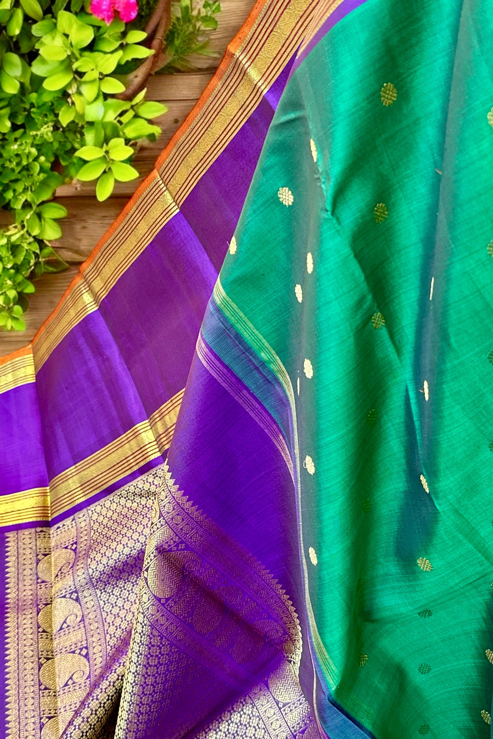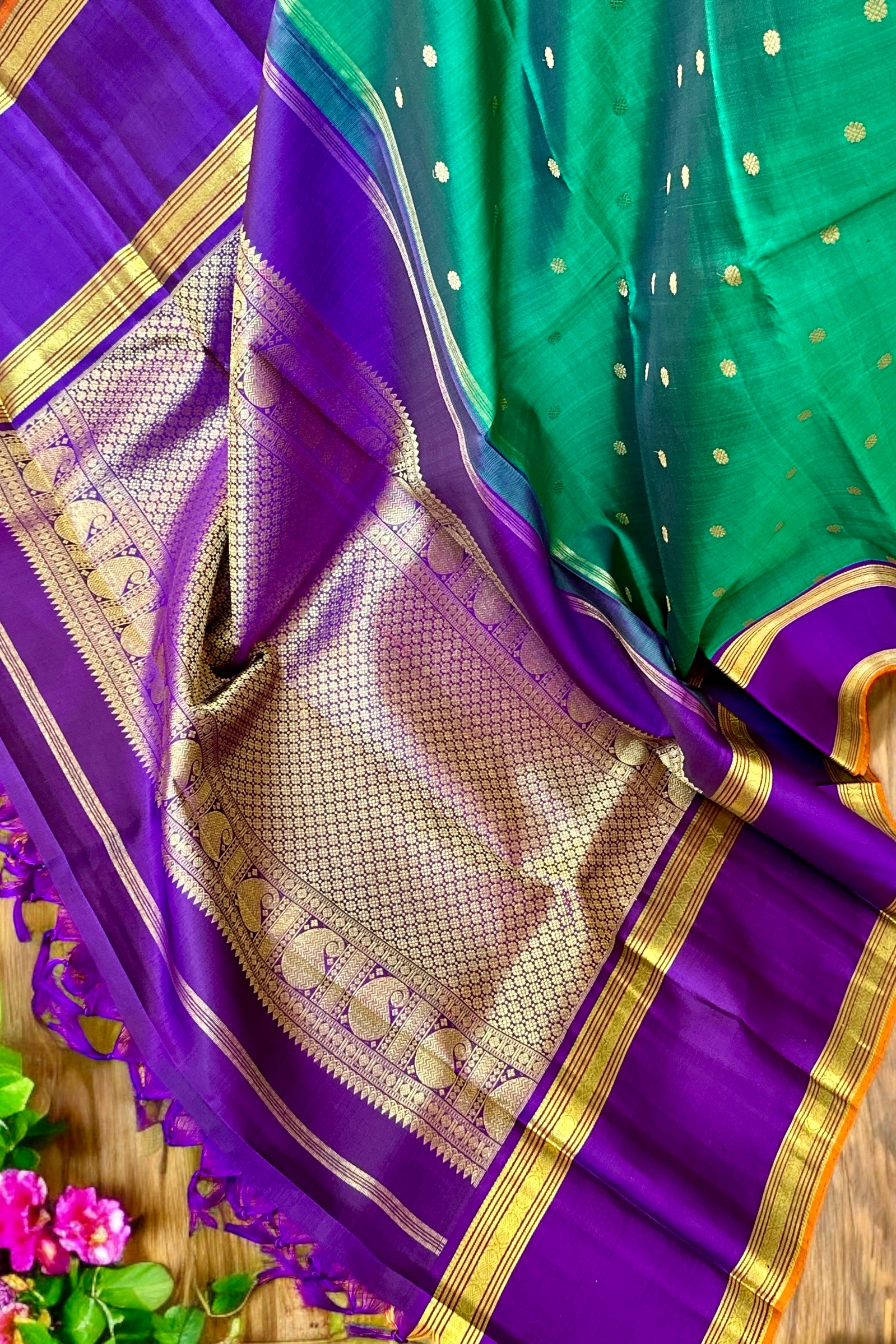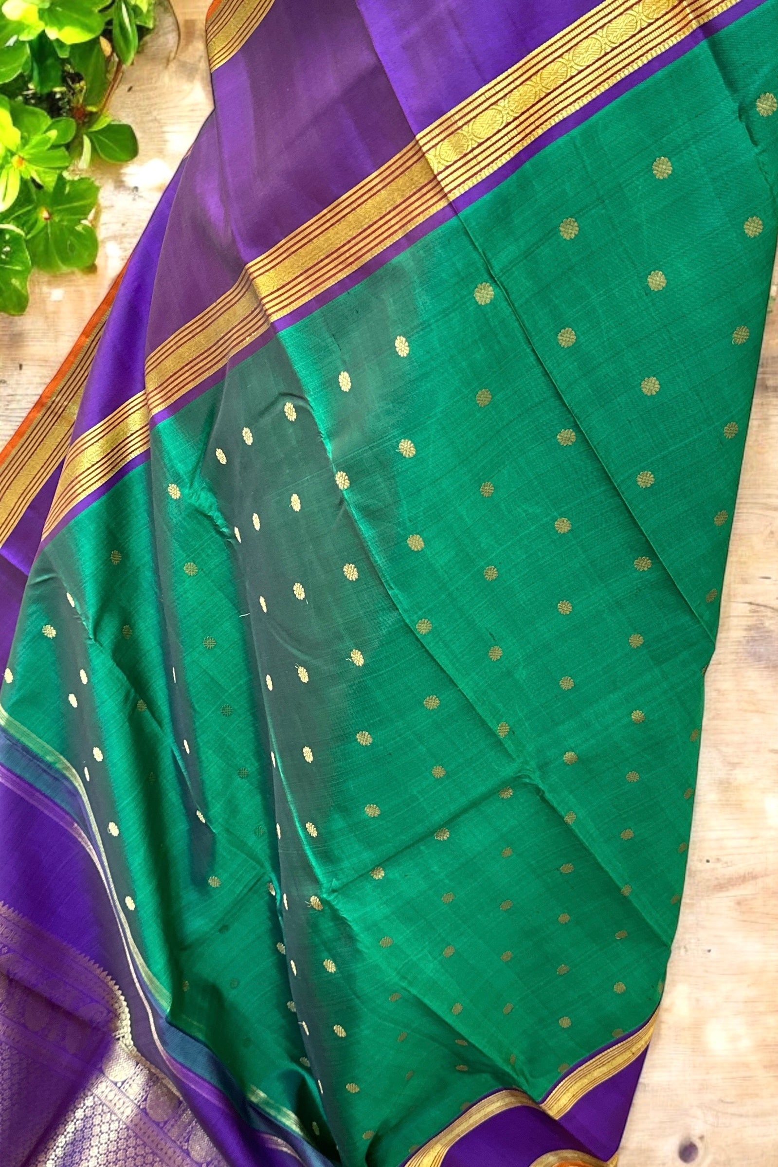 This stunning emerald green Kanjivaram silk saree is a handwoven masterpiece. The intricate gold zari buttas on the body add a touch of elegance, while the purple borders and grand pallu make for a striking contrast. Elevate your traditional wardrobe with this regal piece.