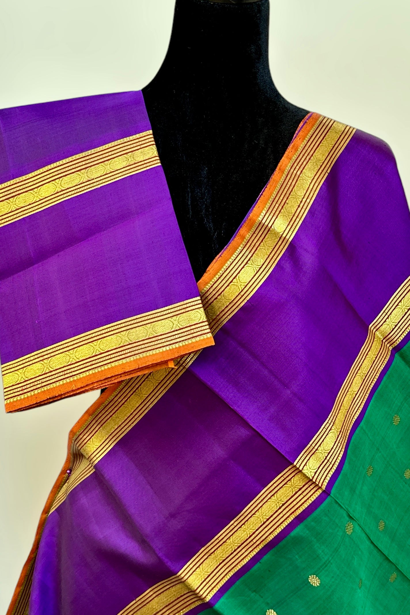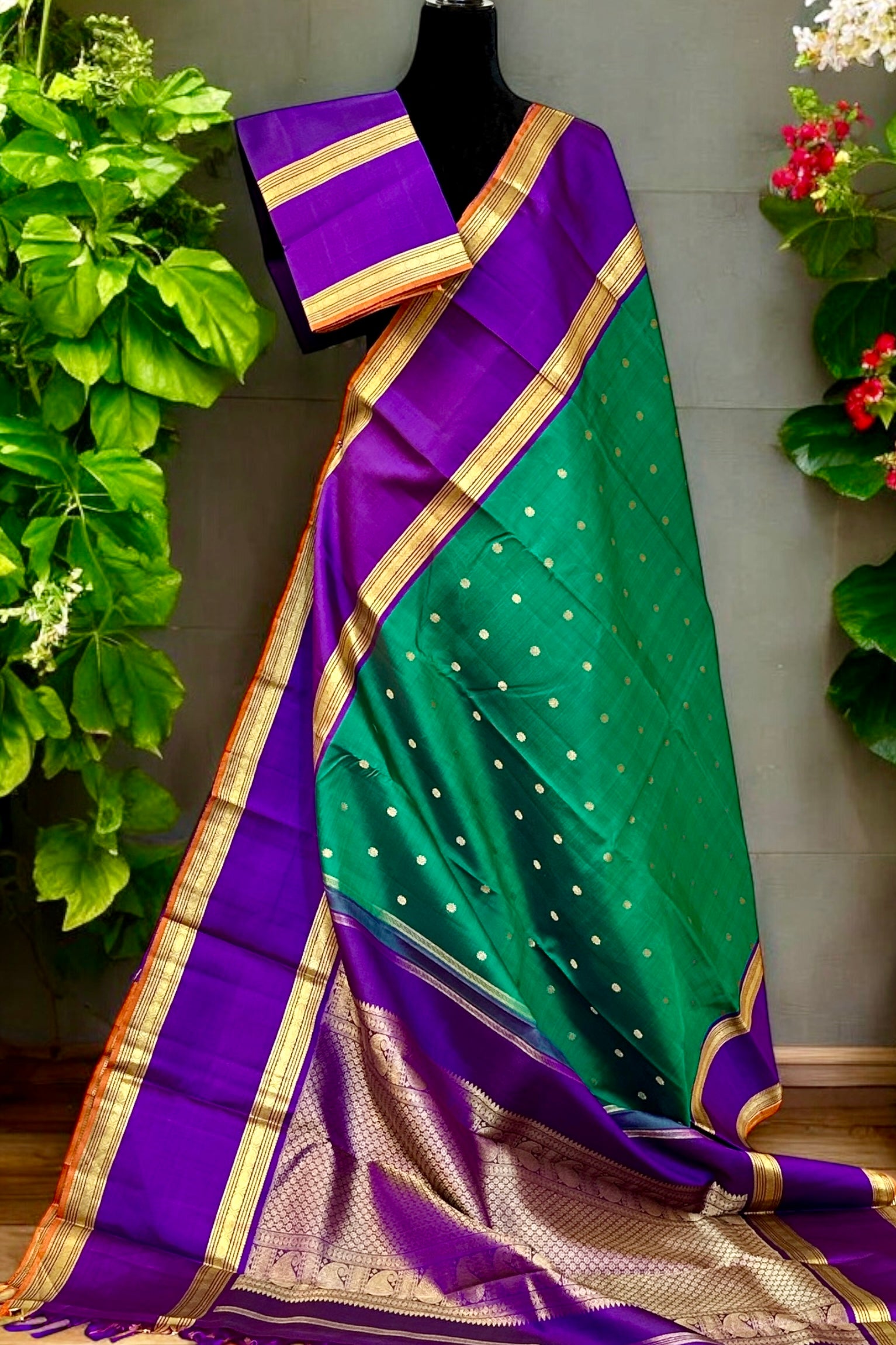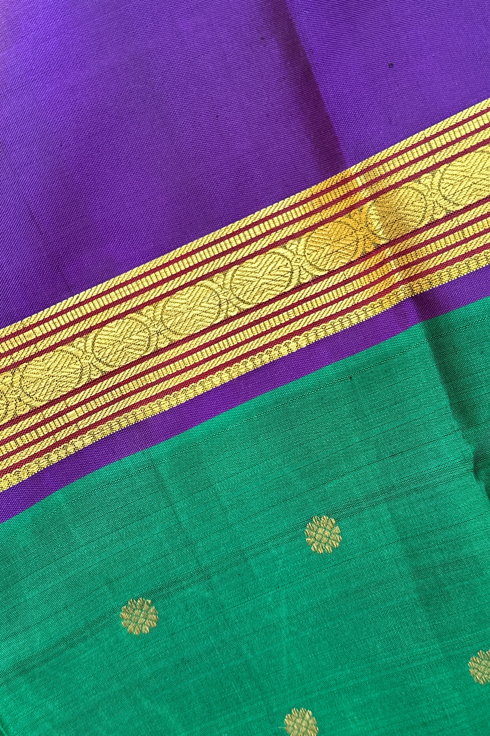 This stunning emerald green Kanjivaram silk saree is a handwoven masterpiece. The intricate gold zari buttas on the body add a touch of elegance, while the purple borders and grand pallu make for a striking contrast. Elevate your traditional wardrobe with this regal piece.