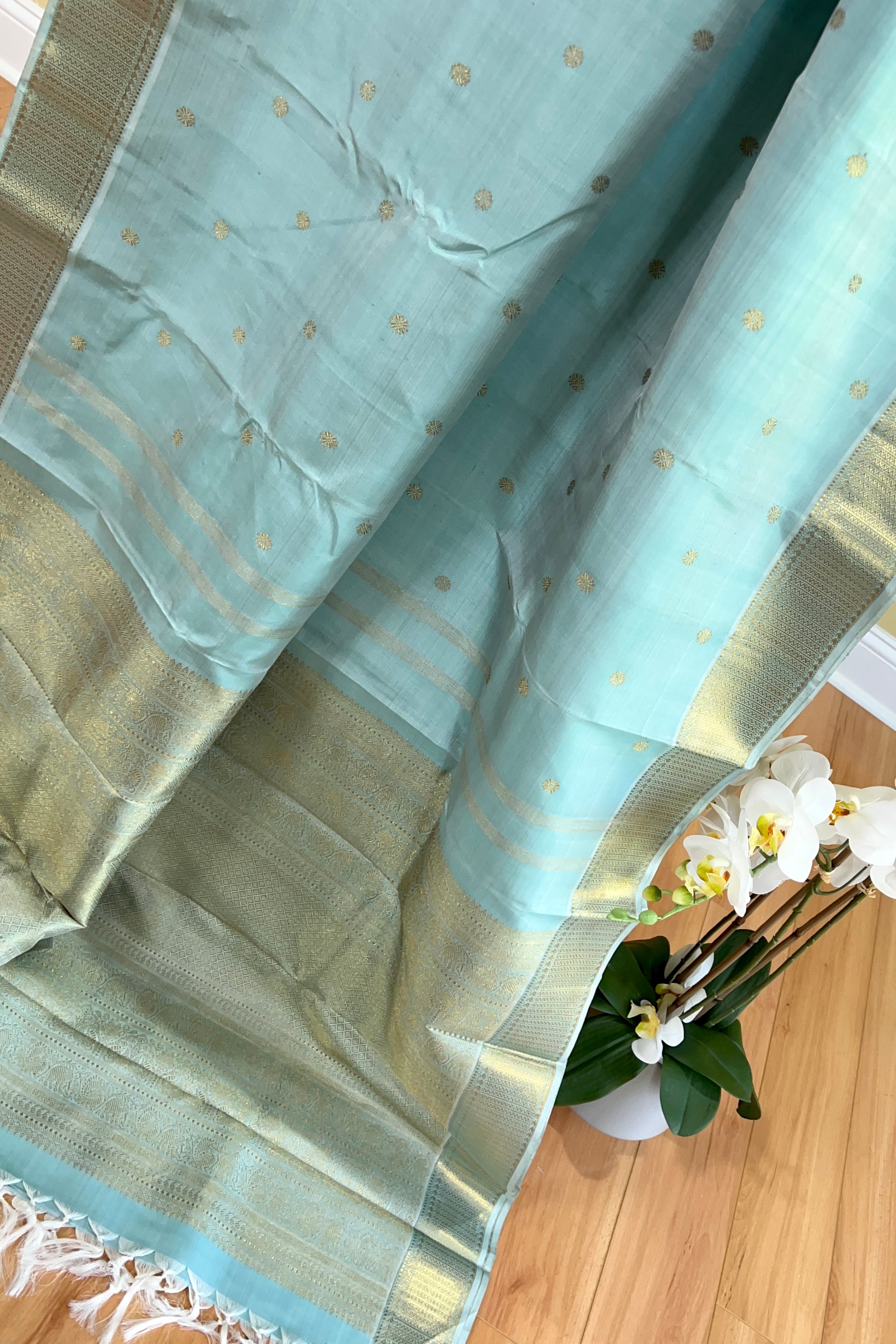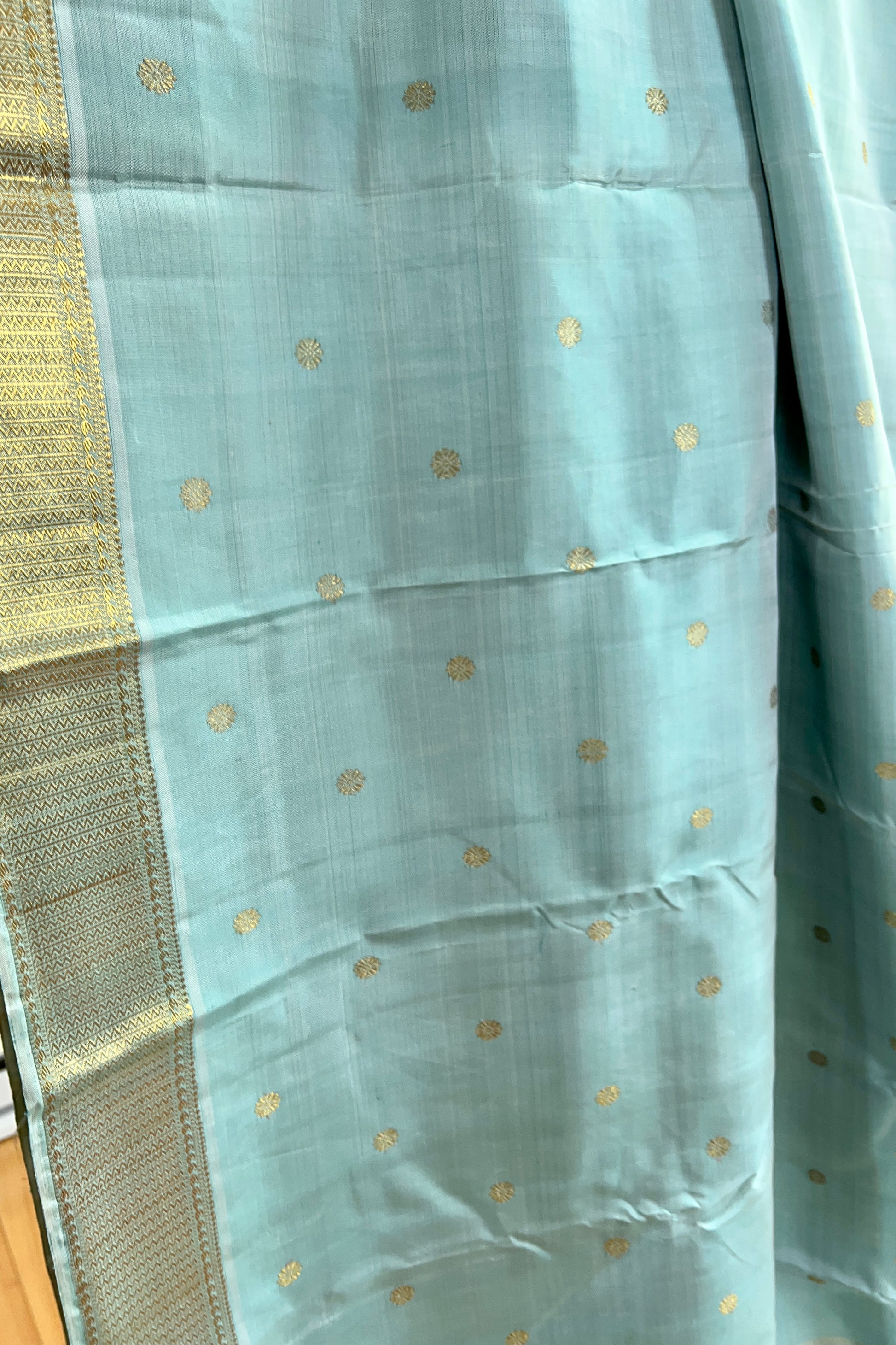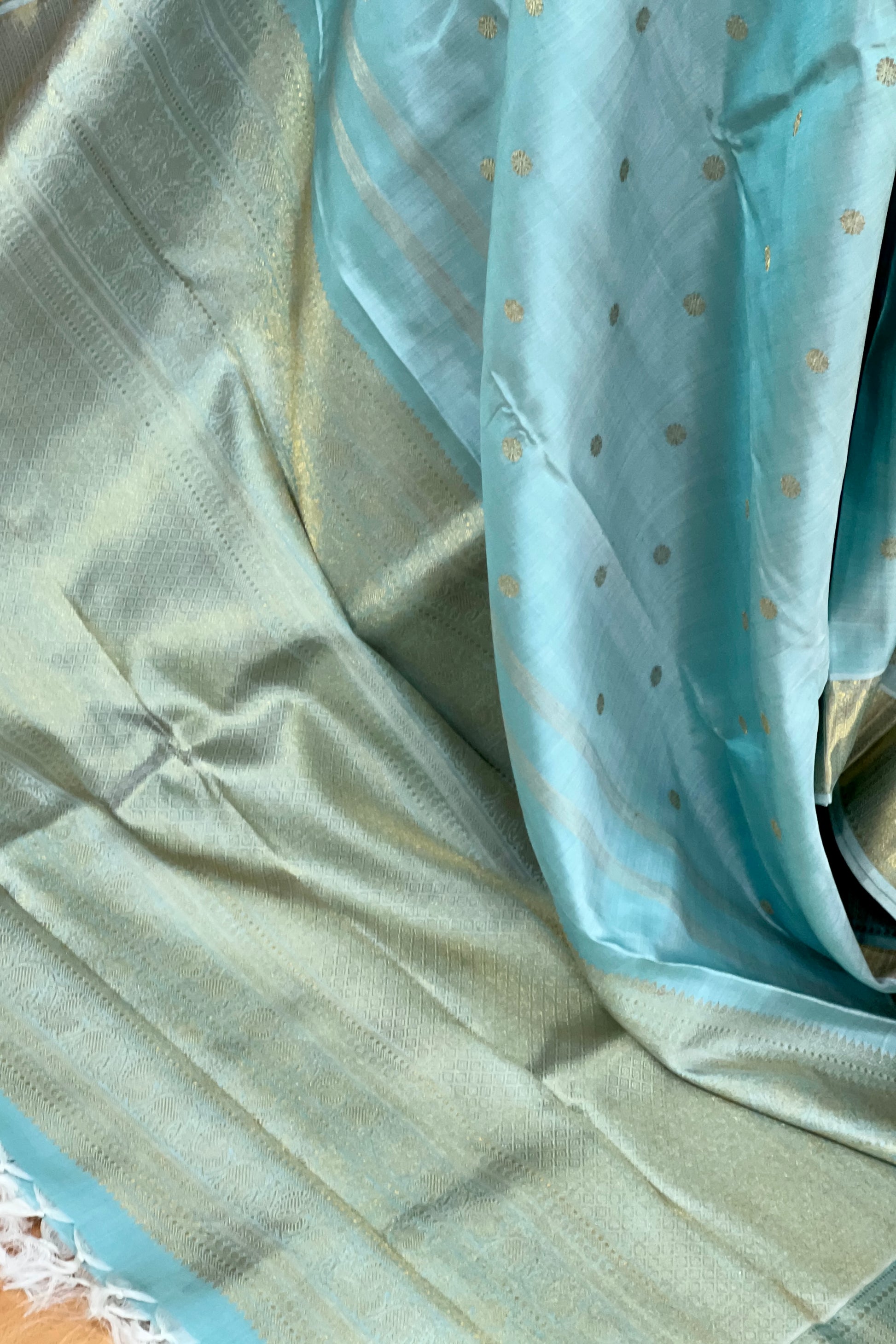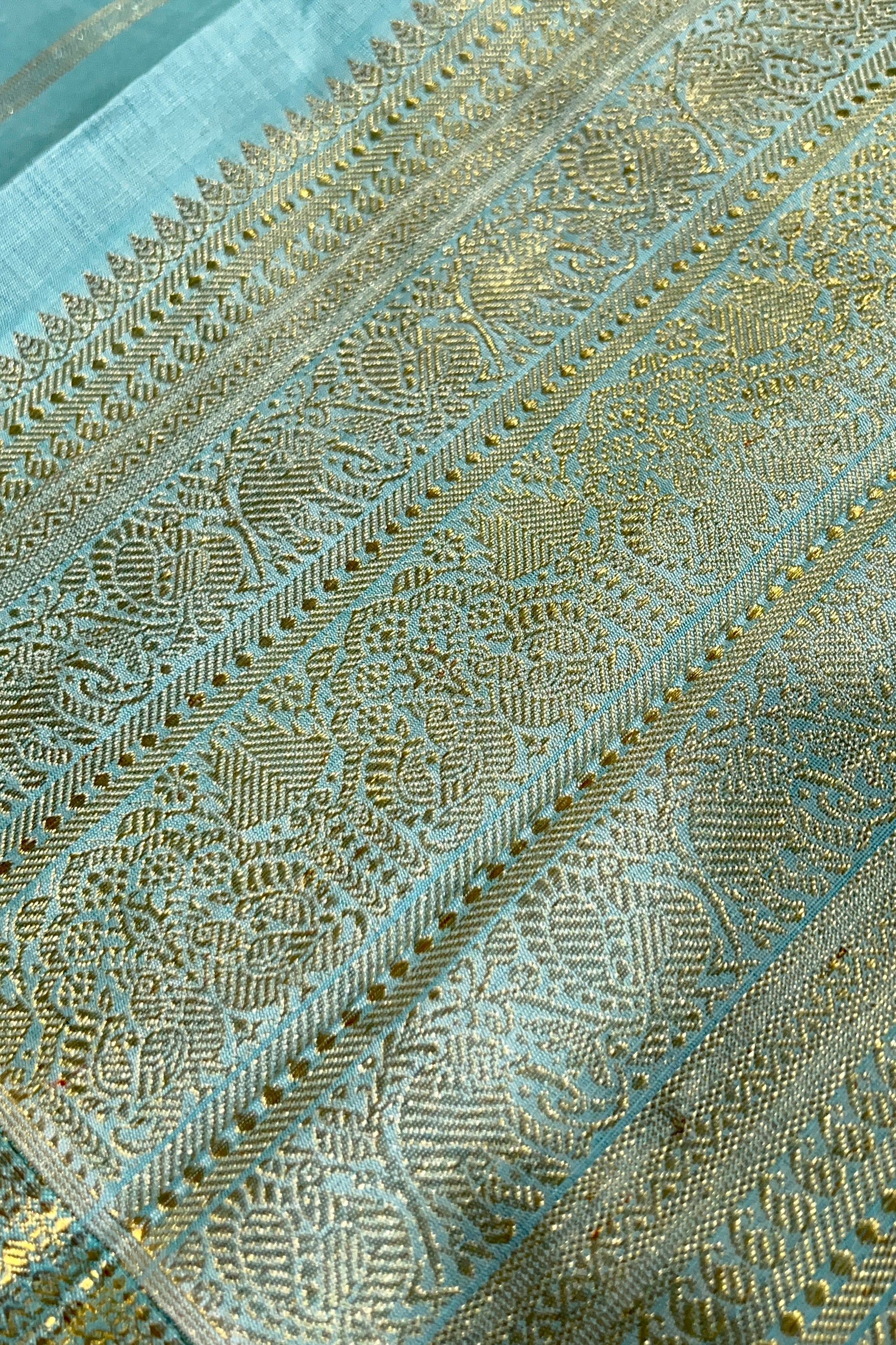 This exquisite kanjivaram saree in turquoise blue shot with ivory beige is handwoven with coin motifs in gold zari, on the body. The self bavangi borders have zigzag lattice motifs along with tiny paisely motifs in gold zari while the grand pallu features traditional motifs in gold zari. The blouse piece is in in the same color as the body of the saree.