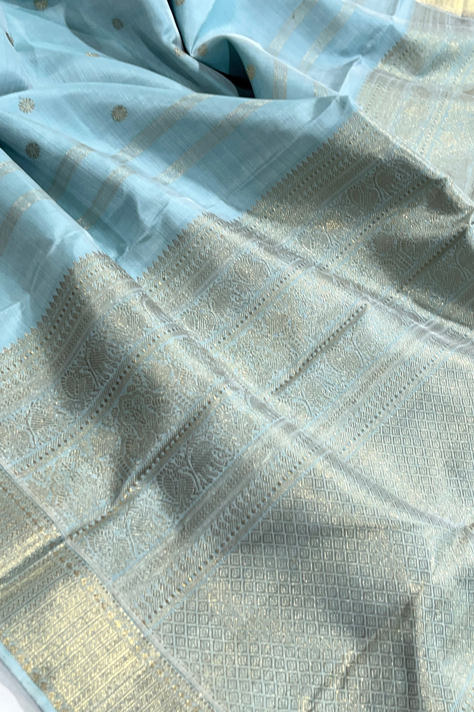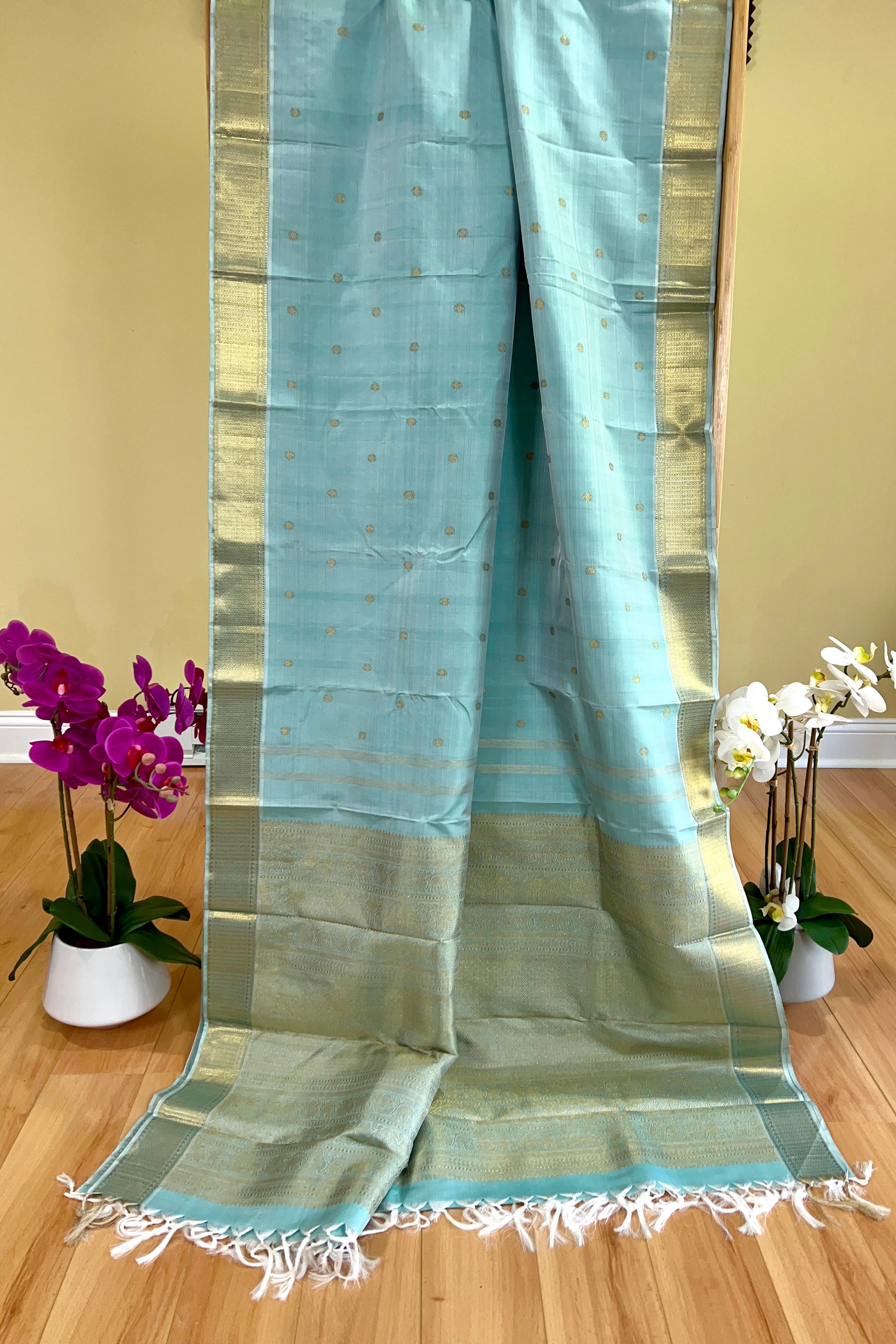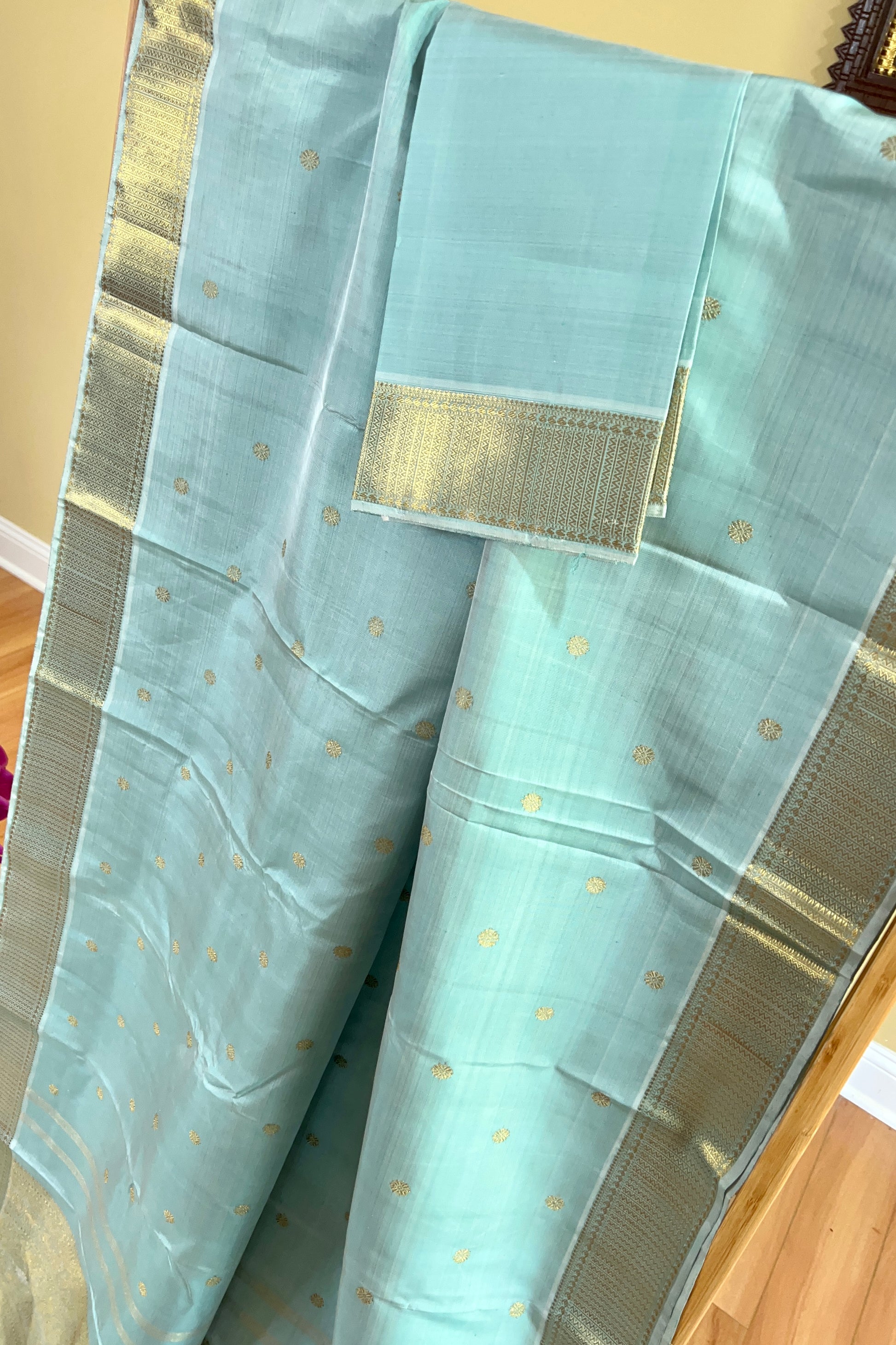 This exquisite kanjivaram saree in turquoise blue shot with ivory beige is handwoven with coin motifs in gold zari, on the body. The self bavangi borders have zigzag lattice motifs along with tiny paisely motifs in gold zari while the grand pallu features traditional motifs in gold zari. The blouse piece is in in the same color as the body of the saree.