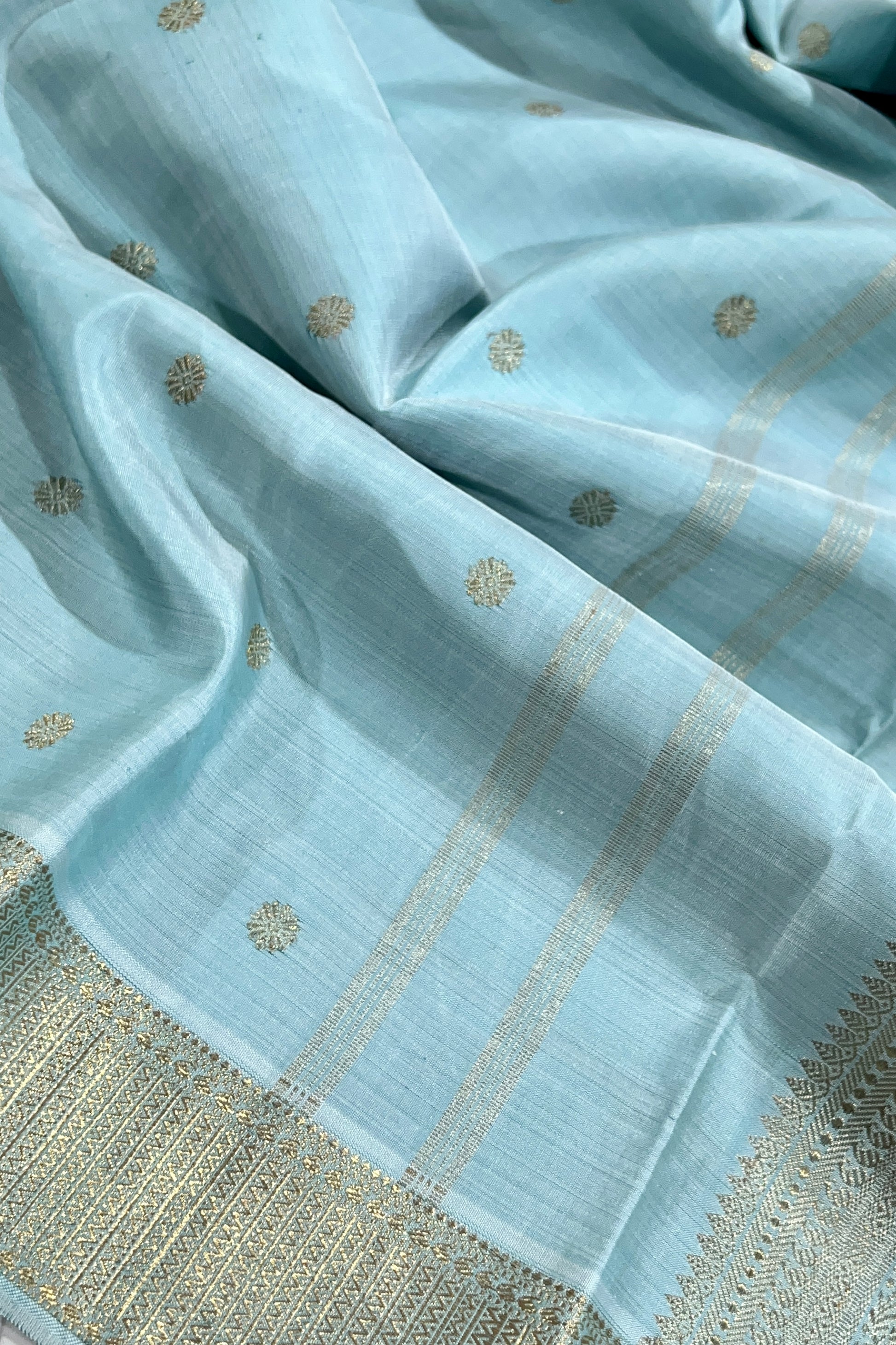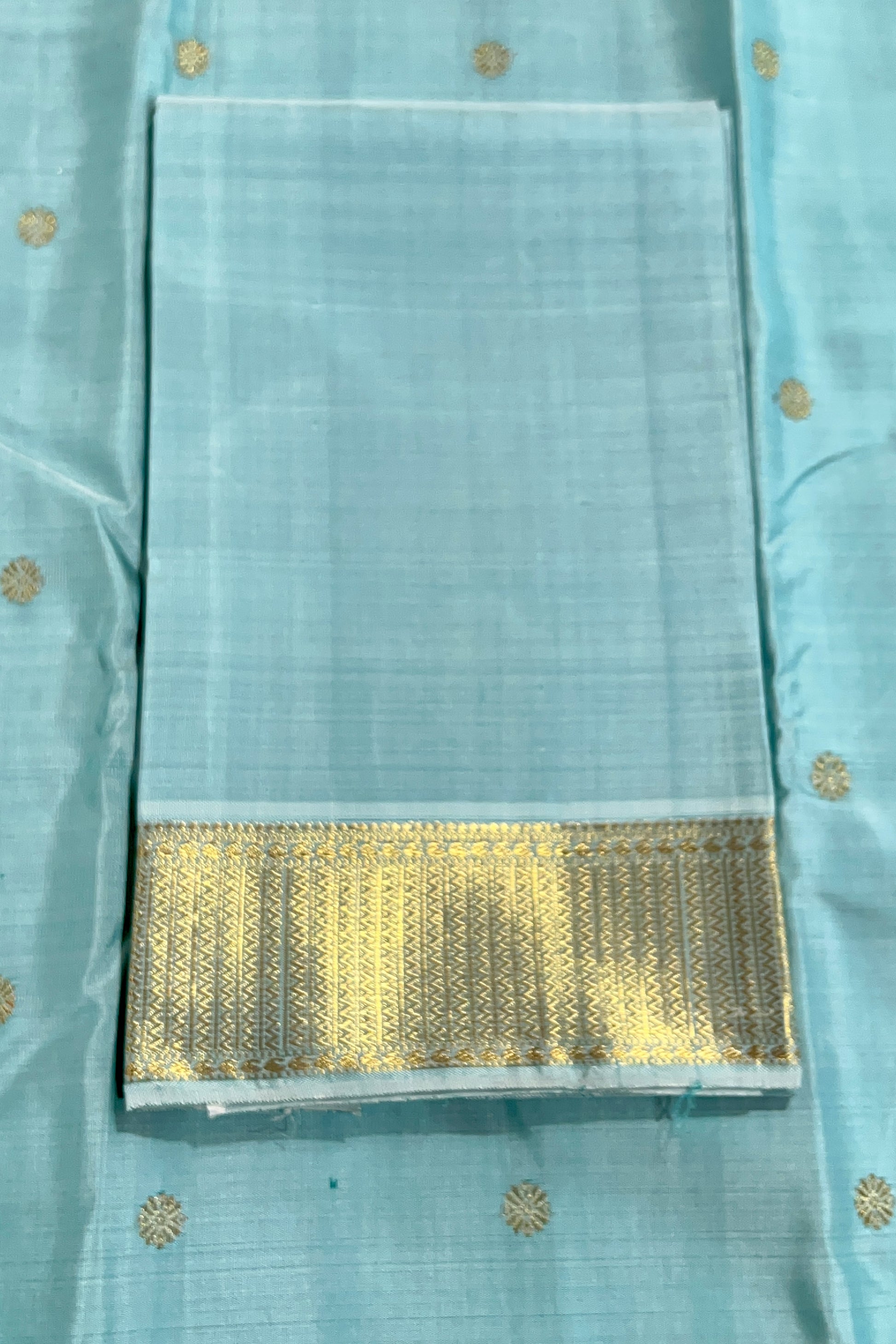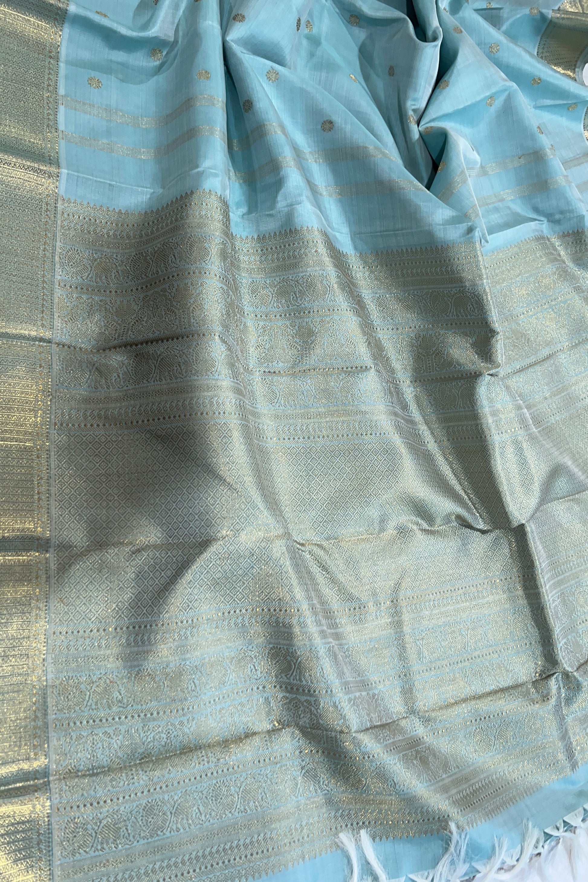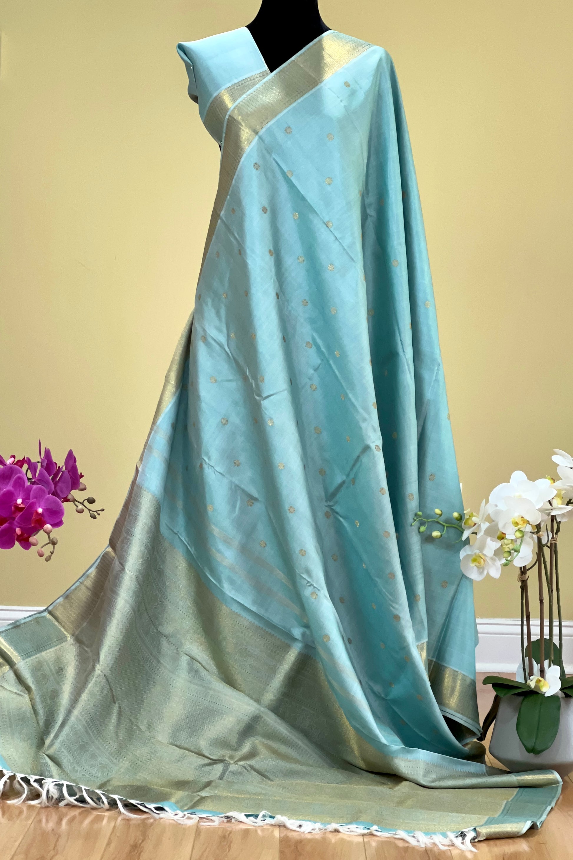 This exquisite kanjivaram saree in turquoise blue shot with ivory beige is handwoven with coin motifs in gold zari, on the body. The self bavangi borders have zigzag lattice motifs along with tiny paisely motifs in gold zari while the grand pallu features traditional motifs in gold zari. The blouse piece is in in the same color as the body of the saree.