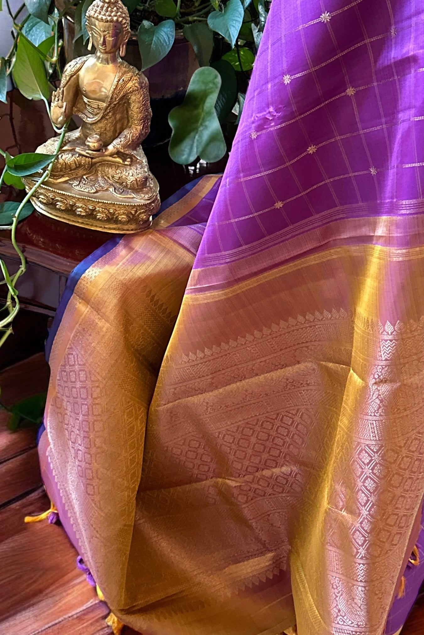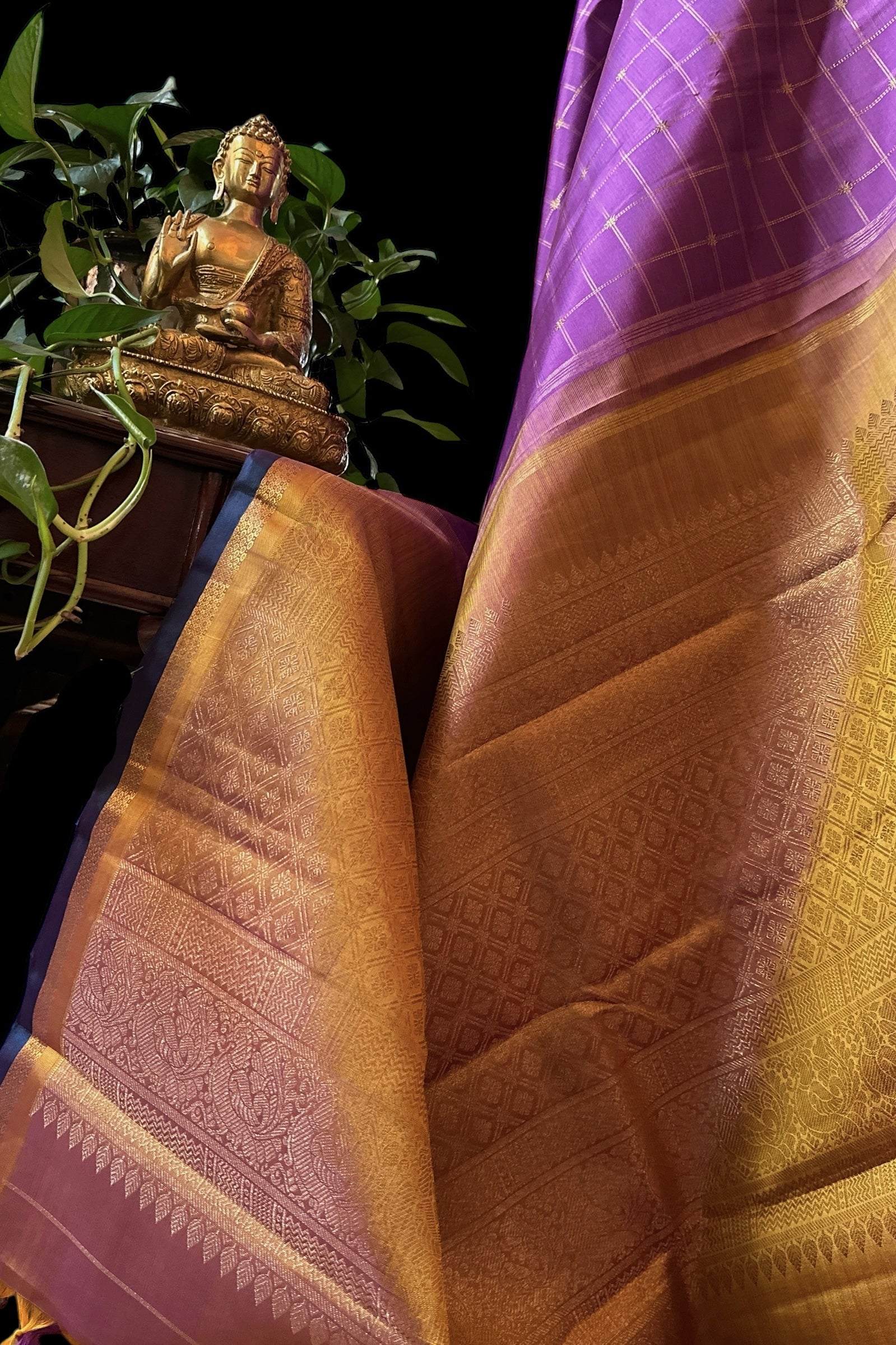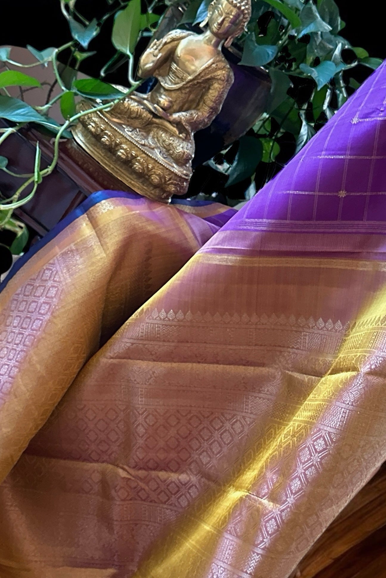 This beautiful kanjivaram saree in a muted purple color is handwoven. The body has checks highlighted by floral buttis in gold zari. The borders have mustard yellow and peacock blue selvedge bordering geometrical pattern woven in gold zari. The grand pallu in the mustard yellow shot with pale teal blue color, features traditional motifs in gold zari.