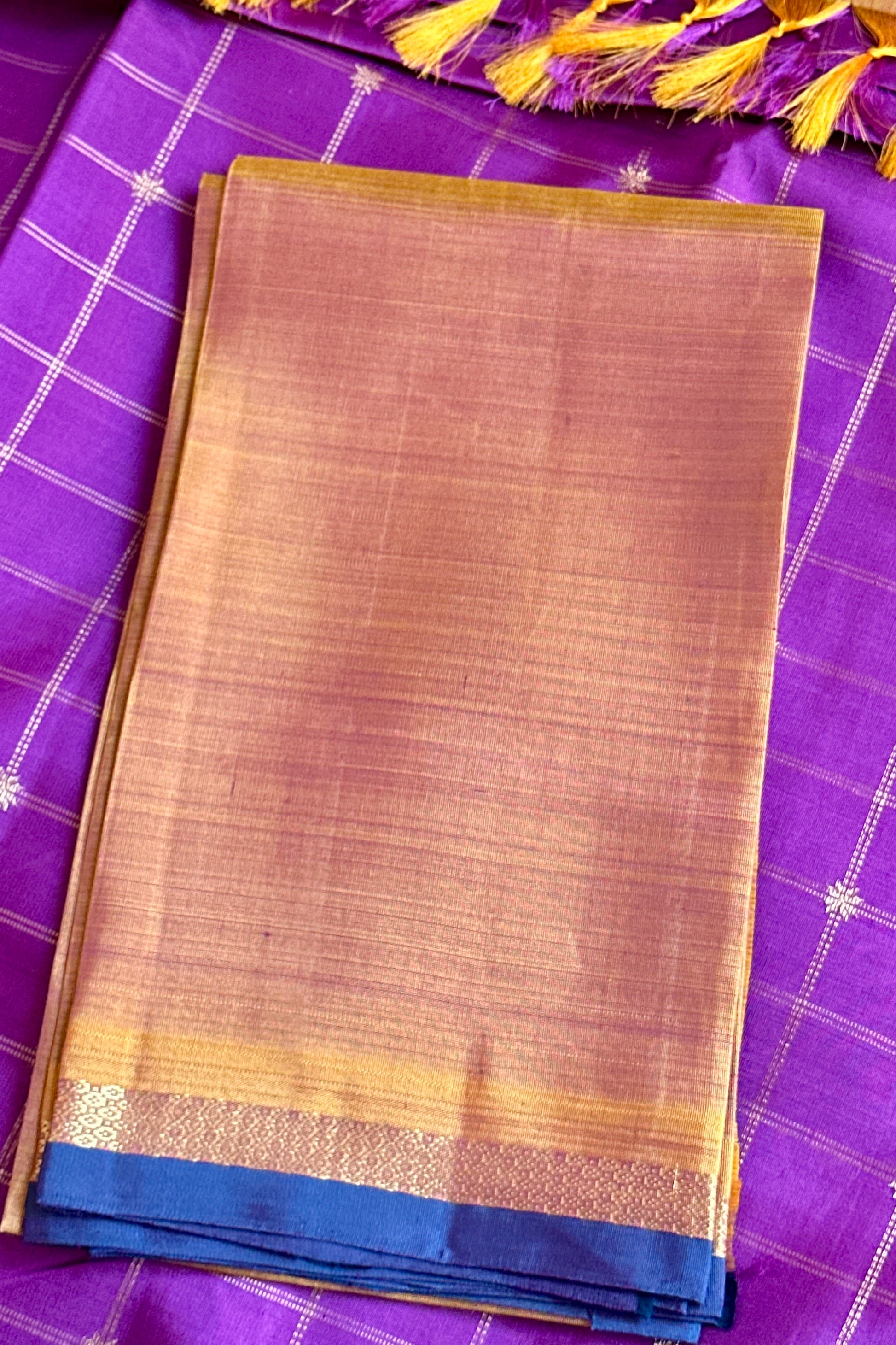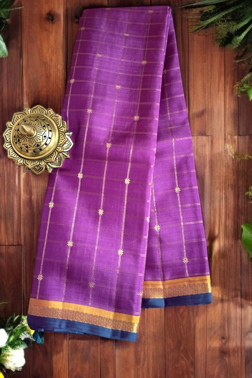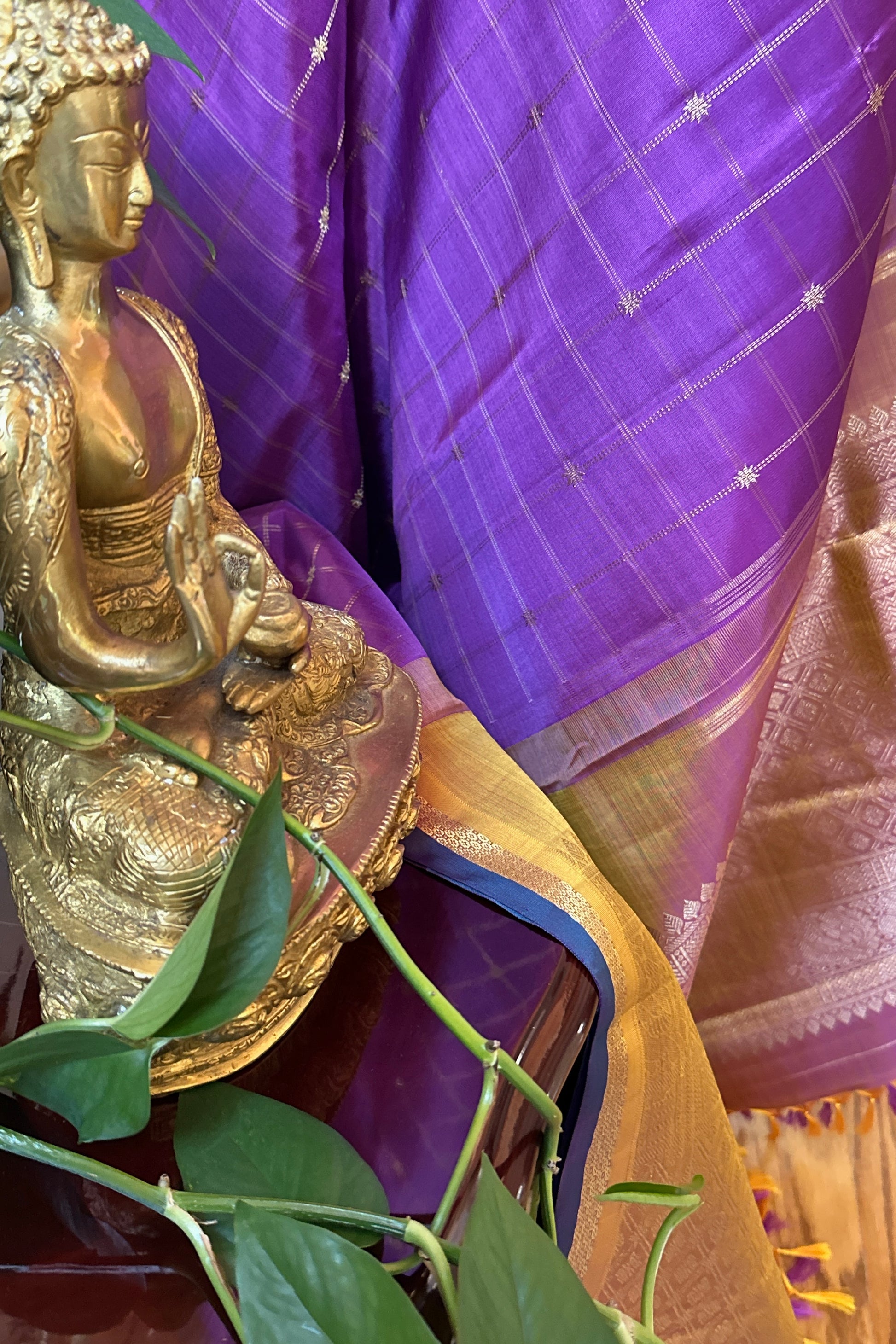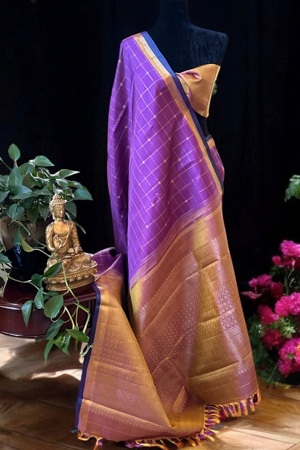 This beautiful kanjivaram saree in a muted purple color is handwoven. The body has checks highlighted by floral buttis in gold zari. The borders have mustard yellow and peacock blue selvedge bordering geometrical pattern woven in gold zari. The grand pallu in the mustard yellow shot with pale teal blue color, features traditional motifs in gold zari.