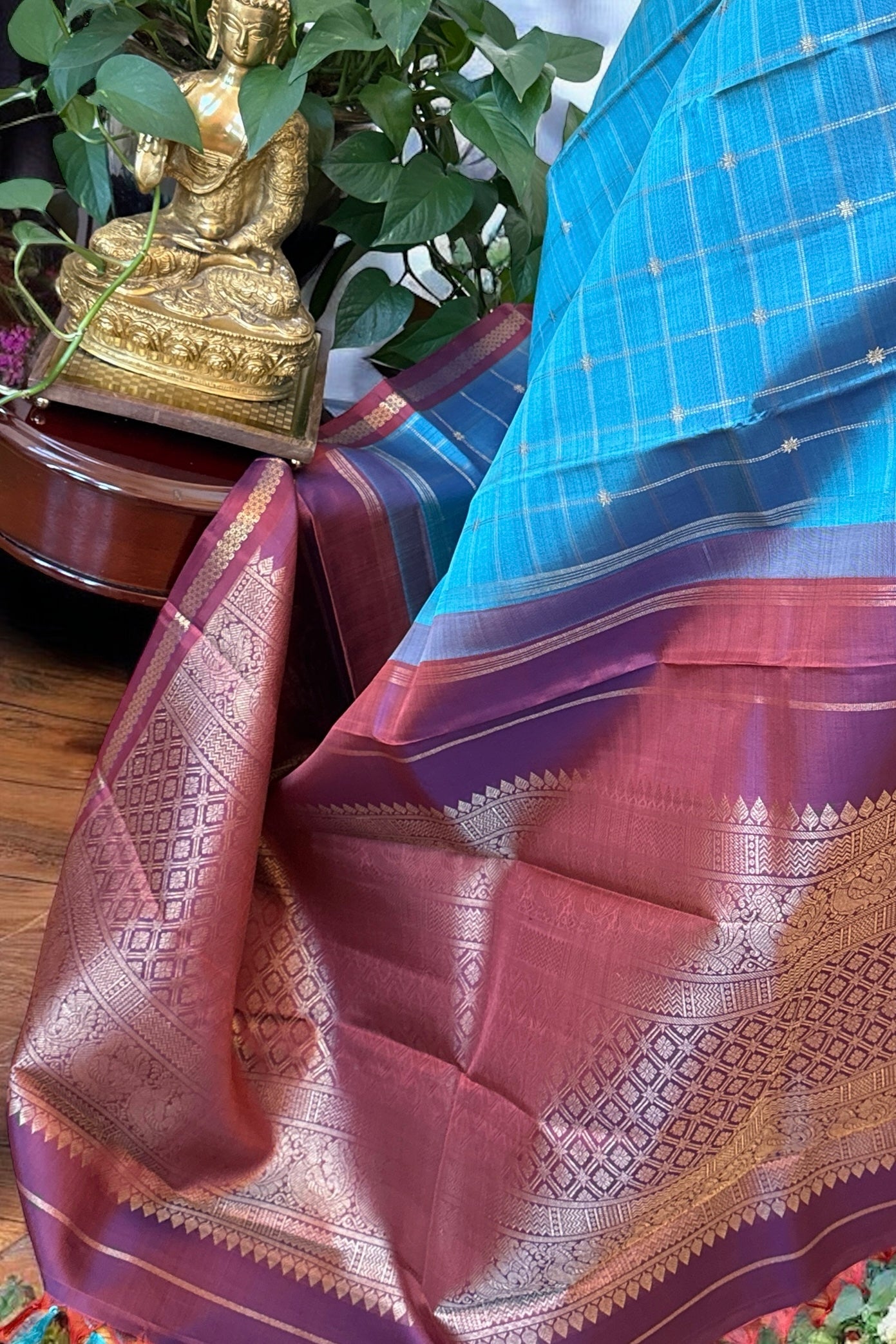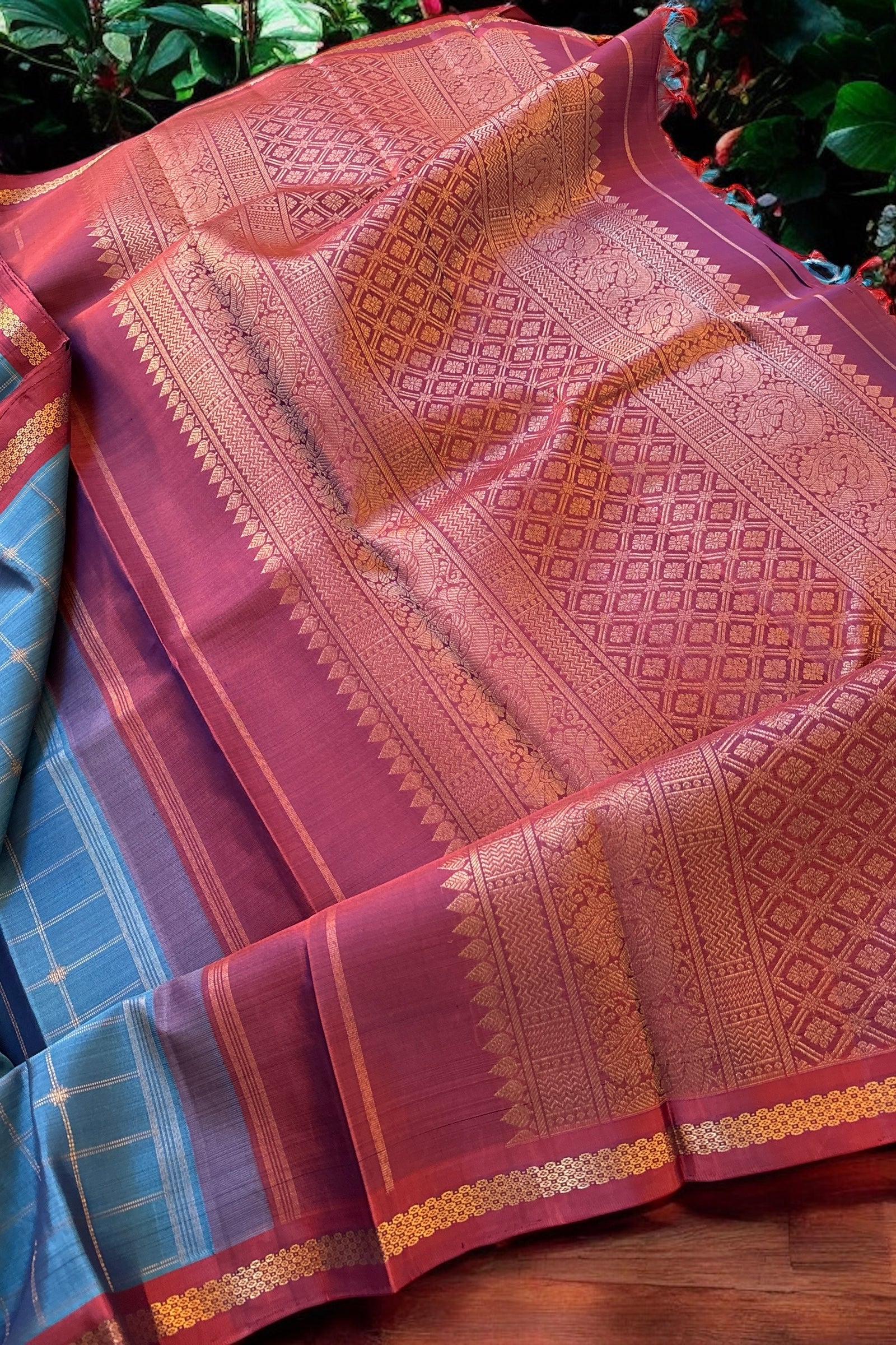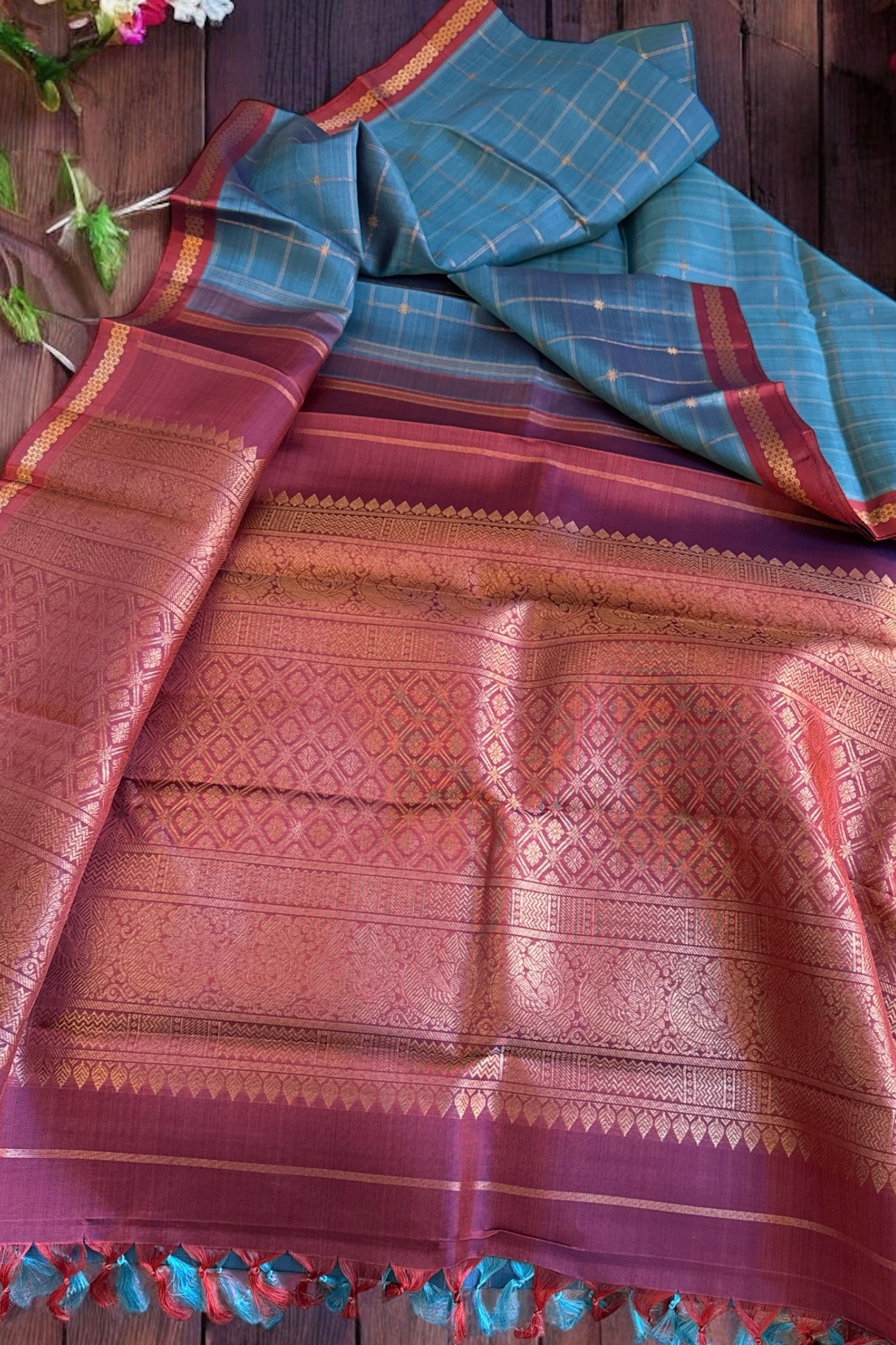 This stunning kanjivaram sari in teal blue is handwoven. The checkered body is adorned with kamalam floral motifs in gold zari. The small border in grape wine color has tiny traditional patterns in gold zari. The grand pallu ingrape wine, features traditional motifs in gold zari. Blouse piece is in grape wine color.