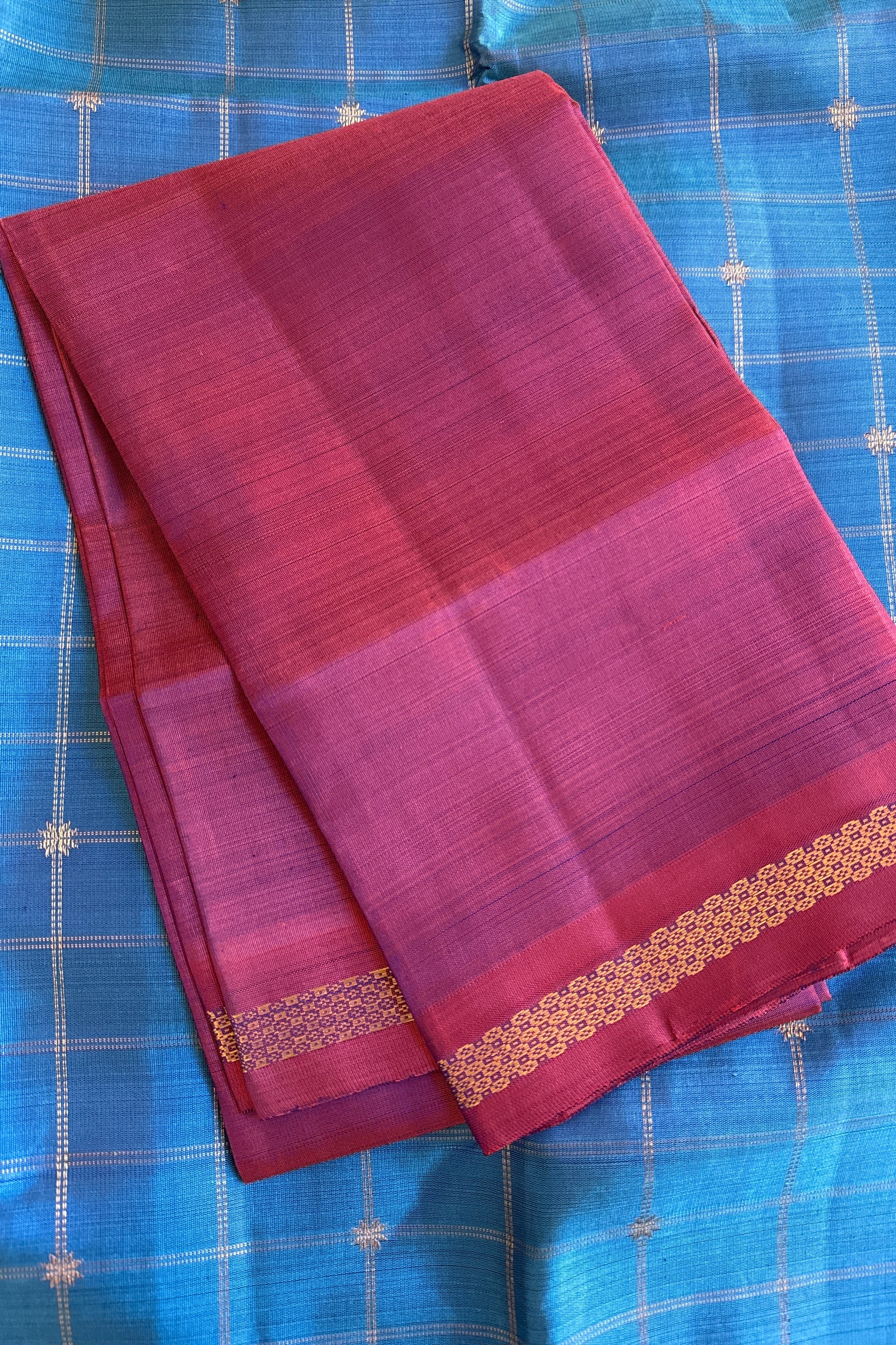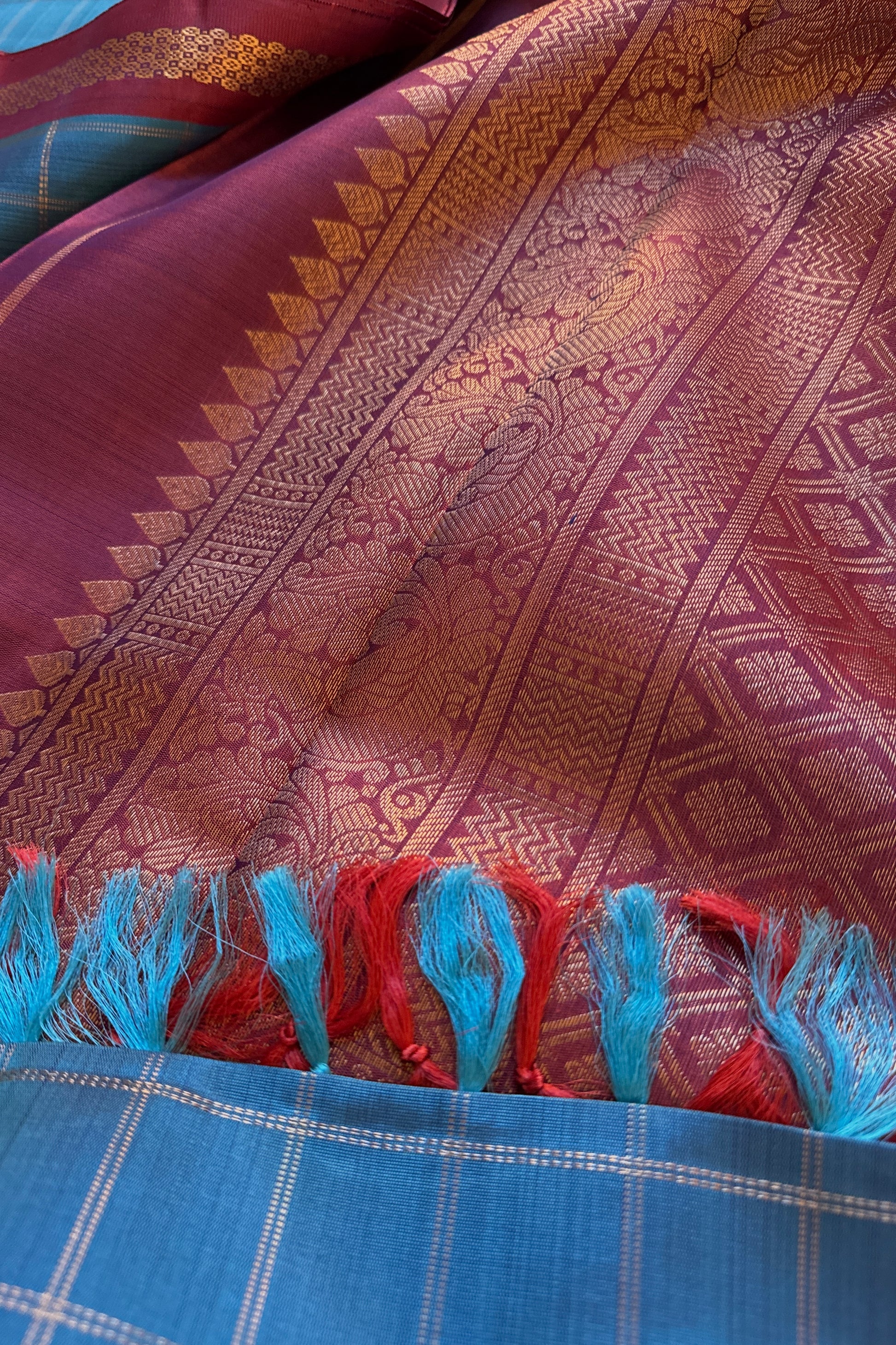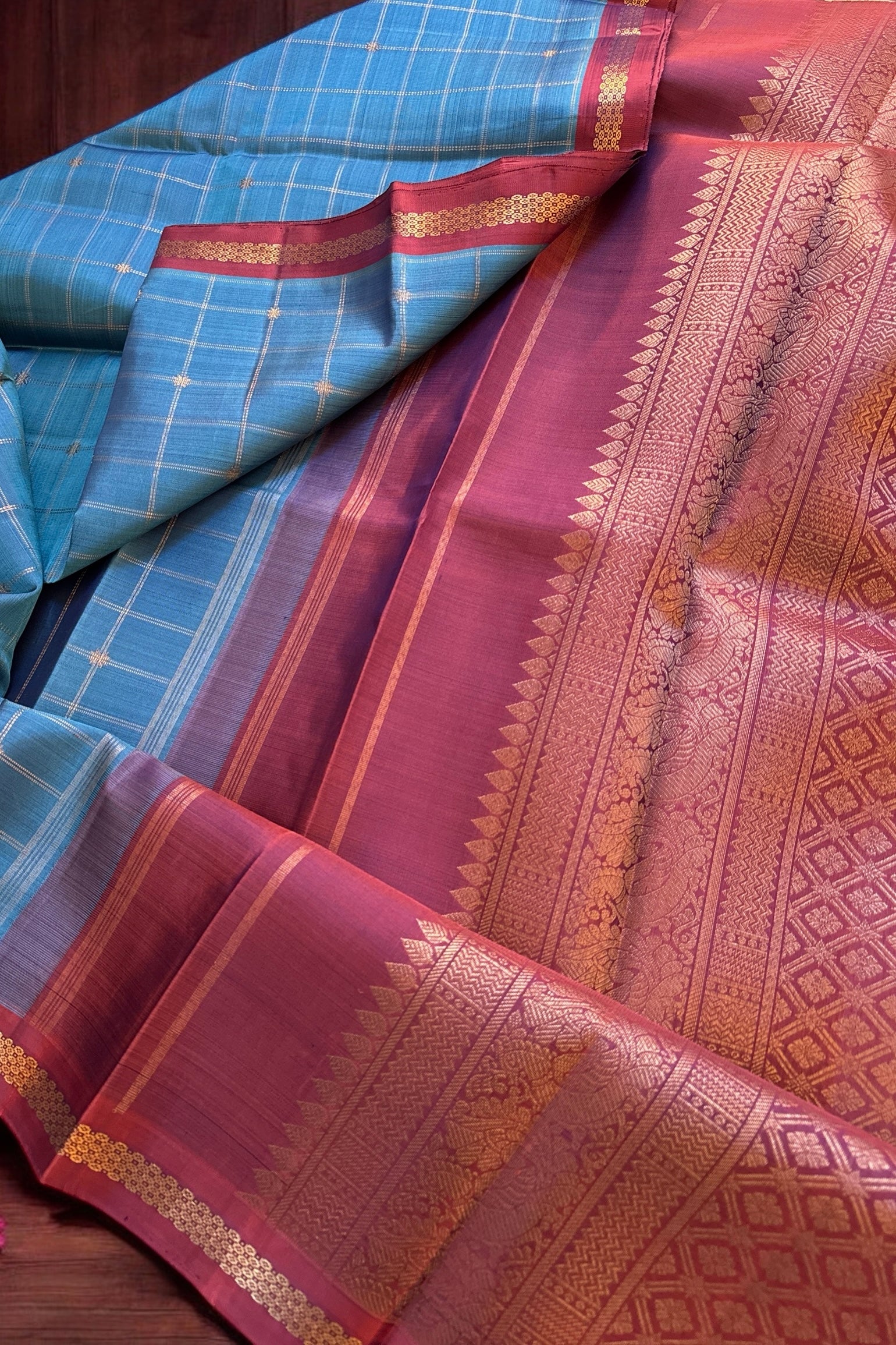 This stunning kanjivaram sari in teal blue is handwoven. The checkered body is adorned with kamalam floral motifs in gold zari. The small border in grape wine color has tiny traditional patterns in gold zari. The grand pallu ingrape wine, features traditional motifs in gold zari. Blouse piece is in grape wine color.