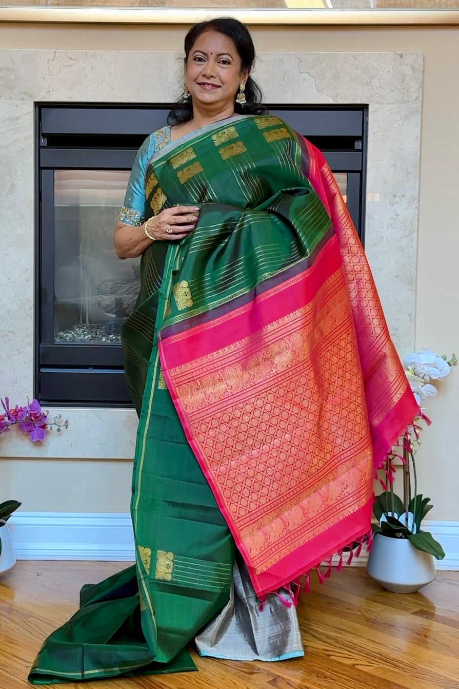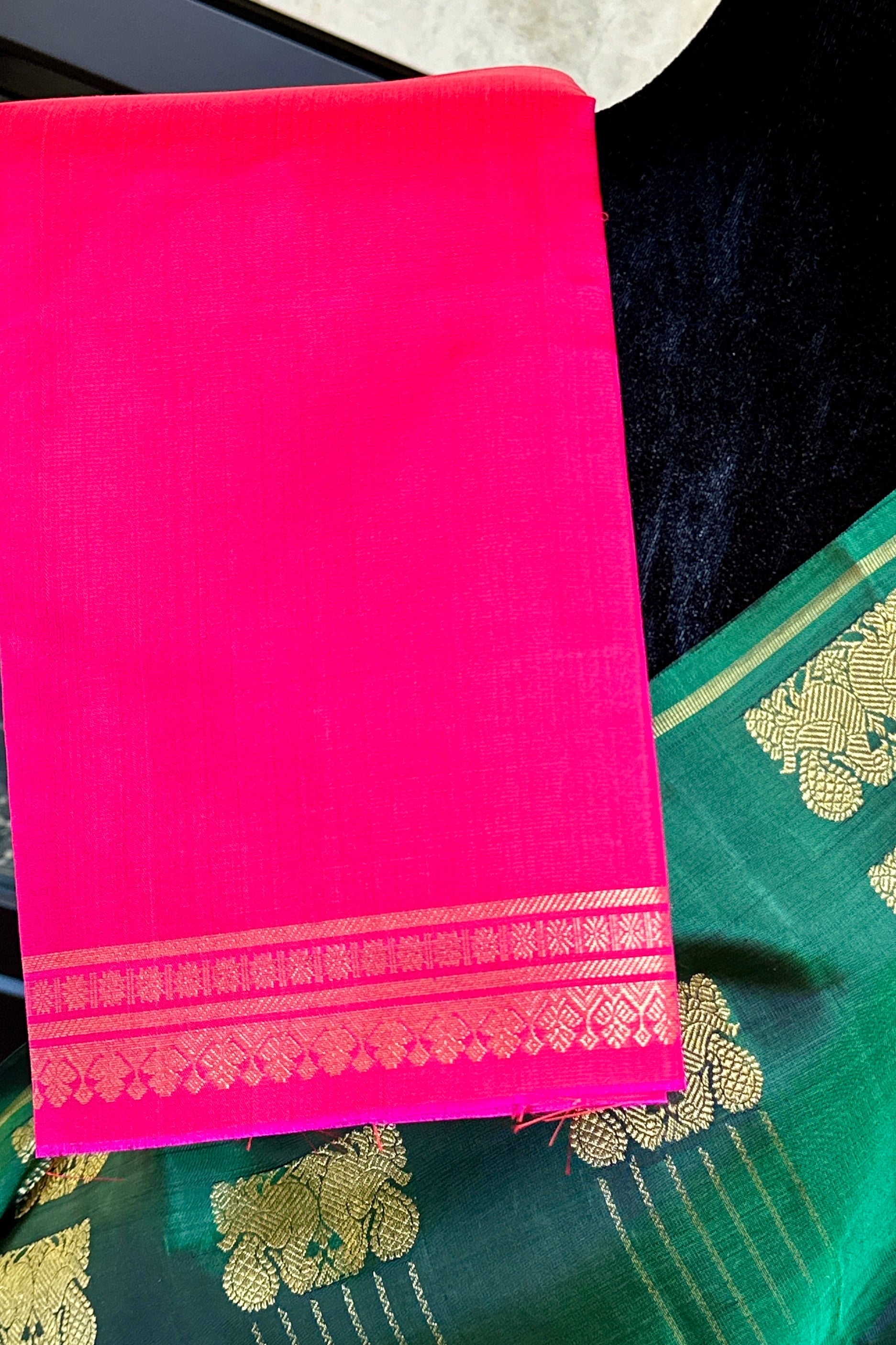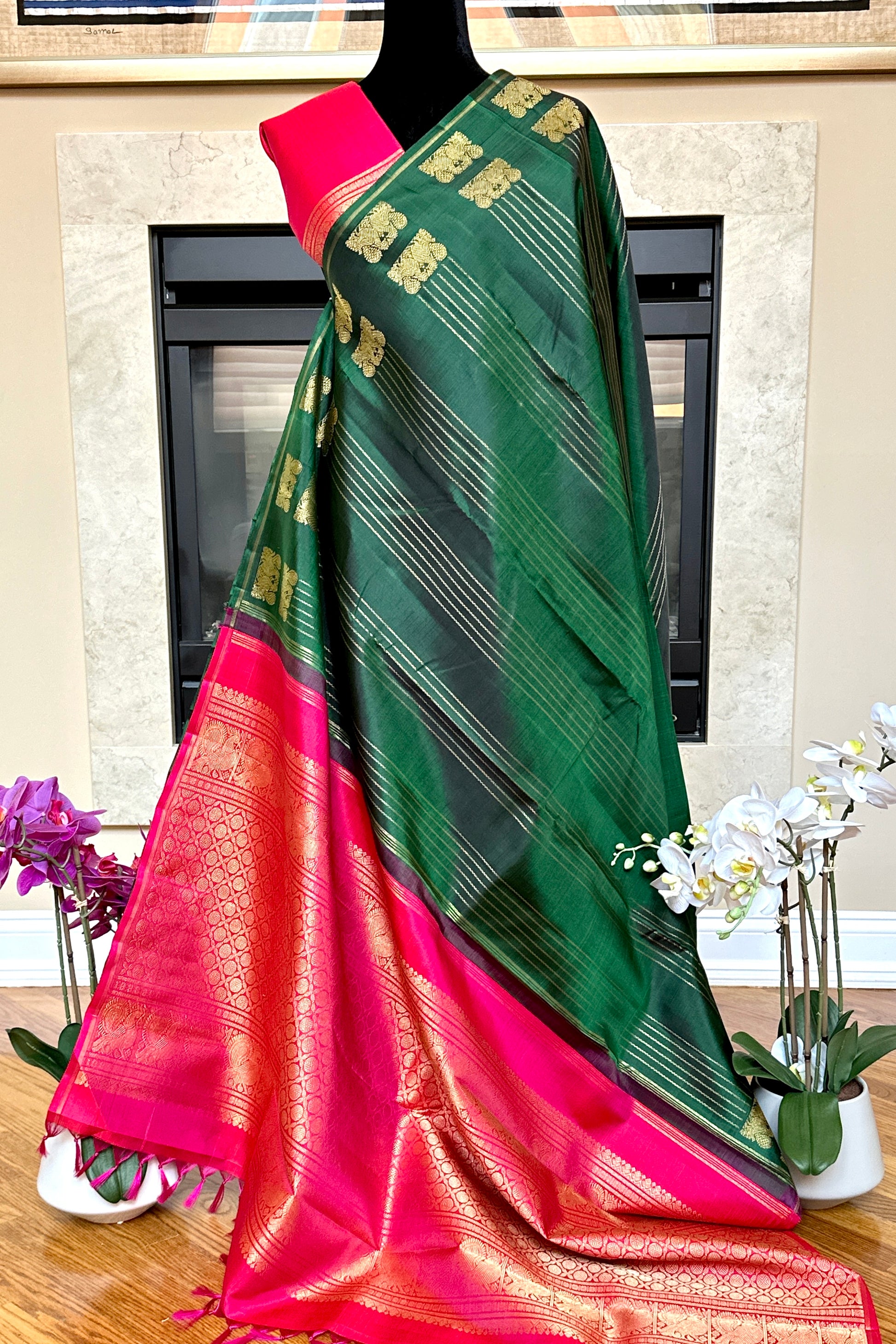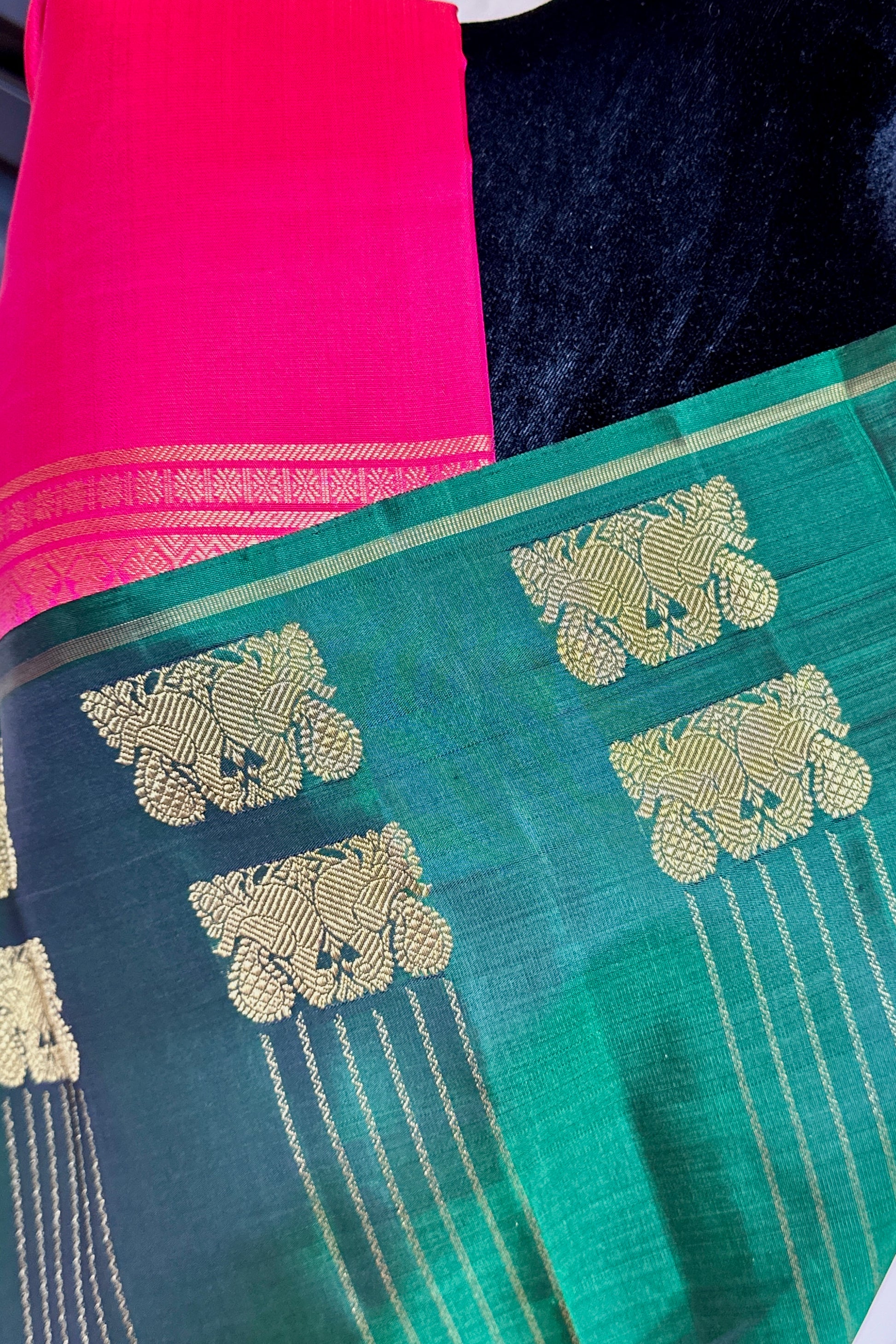 This stunning semi-borderless kanjivaram silk saree in dark green is handwoven. The grand pallu is in rani pink. The semi-borderless border is adorned with peacocks in gold zari facing at each other. The body is adorned with vertical veldari lines in gold zari. The blouse piece is cut and in the same color as the pallu.