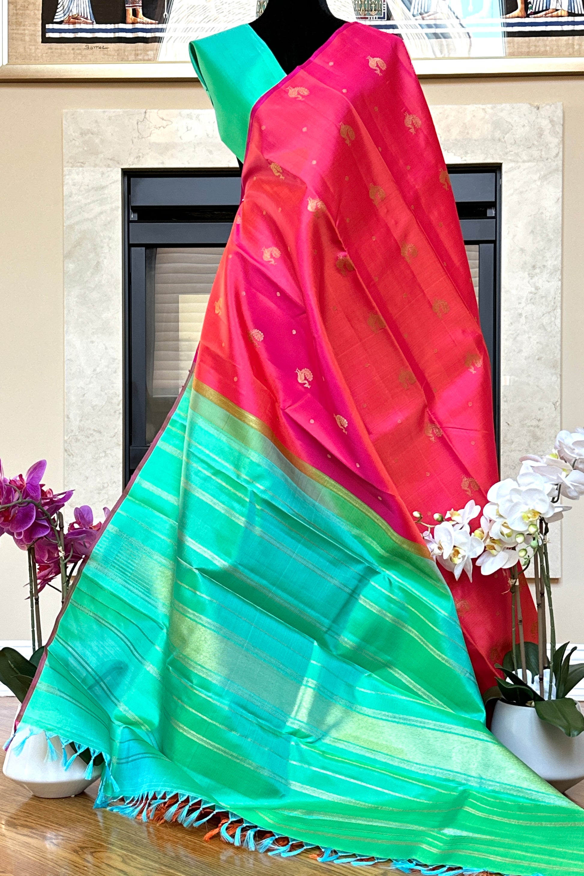 This stunning borderless kanjivaram silk saree in orange shot with magenta pink is handwoven. The simple seer pallu is in seafoam blue color. The body is adorned with peacock motifs in different sizes in gold zari. The blouse piece is in the same color as the pallu.