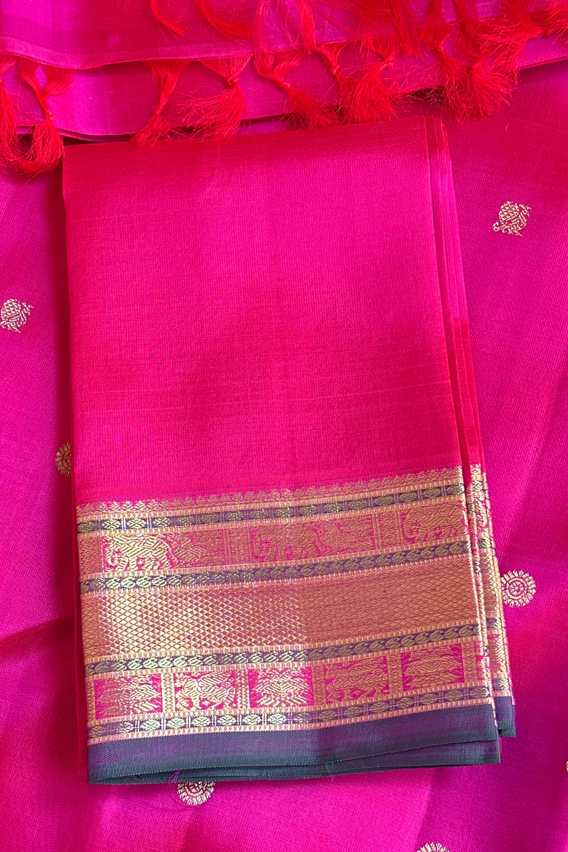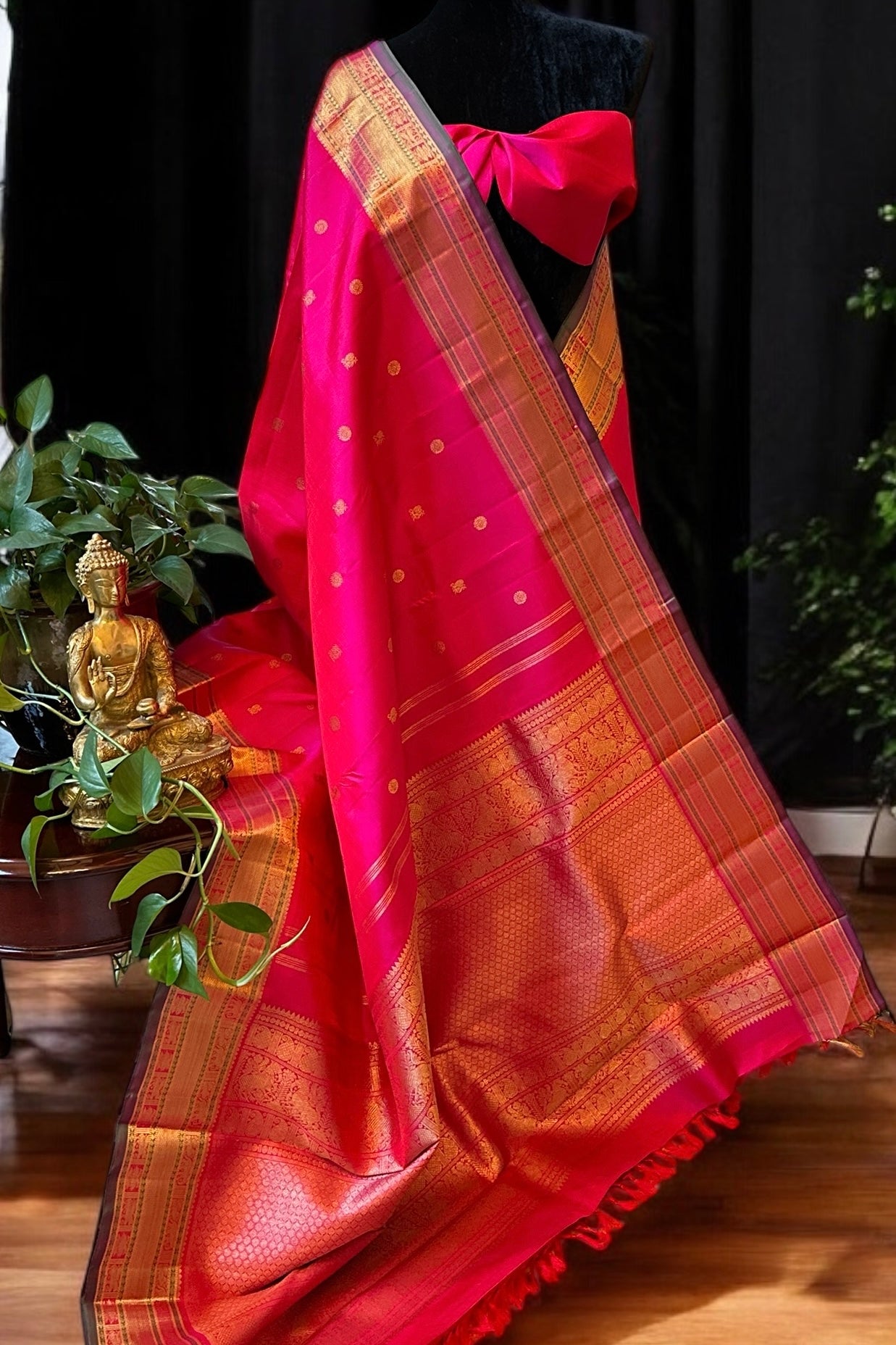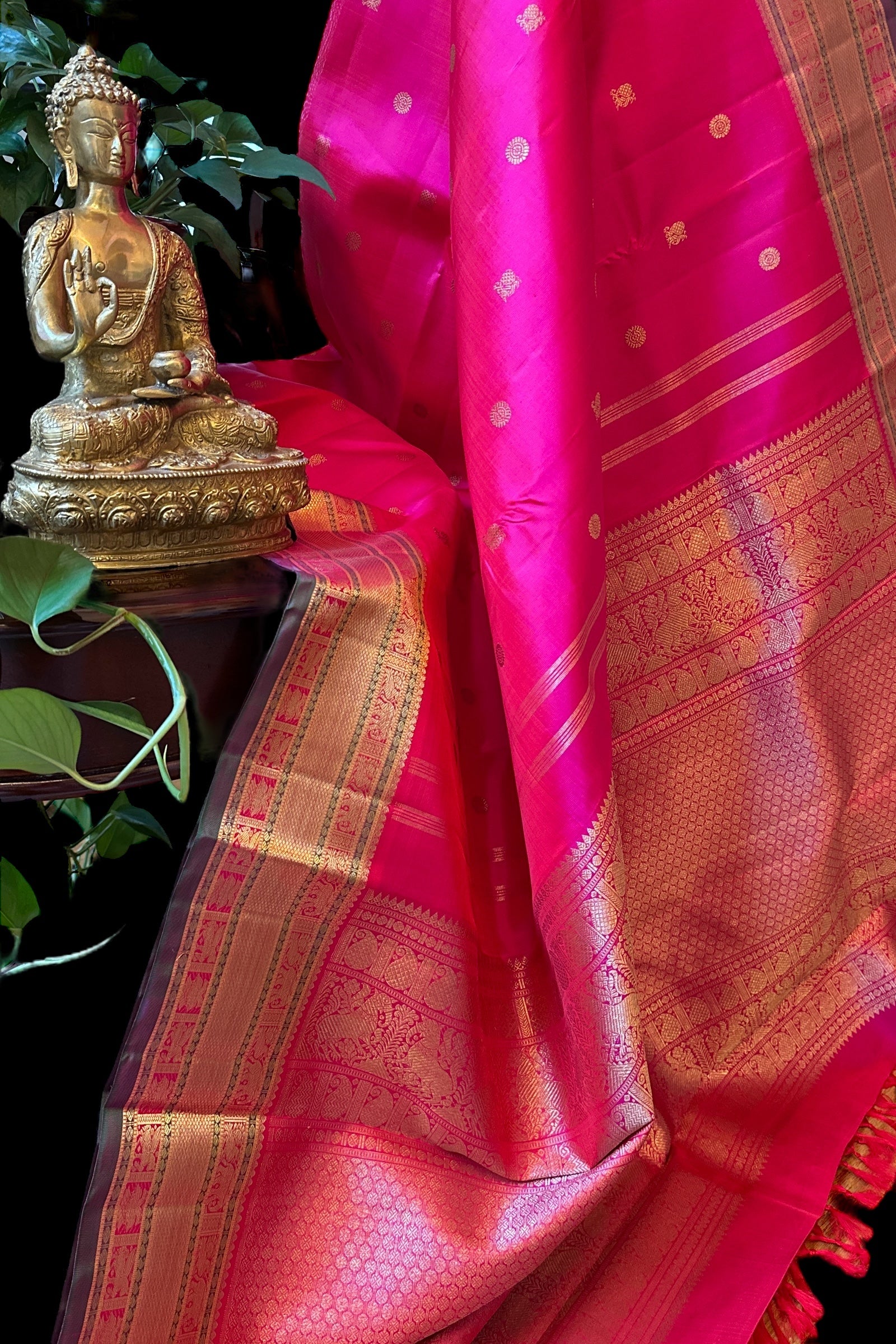 This stunning kanjivaram saree in hot pink shot with ruby red is handwoven. The body is adorned with floral in gold zari, all over the body. The borders have twill, rudraksham and geometric patterns in gold zari, along with a selvedge in peacock green. The grand pallu features traditional motifs in gold zari.