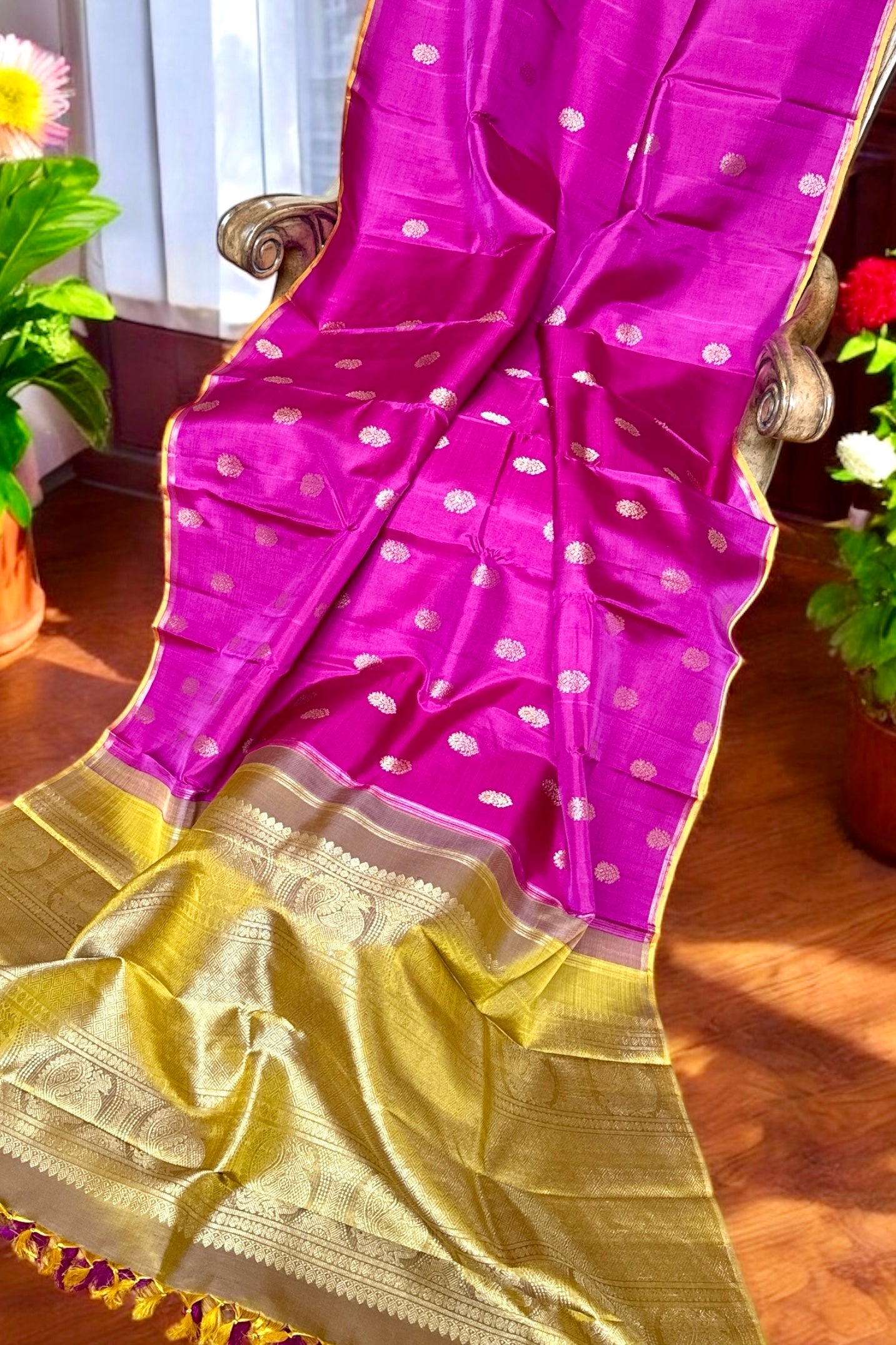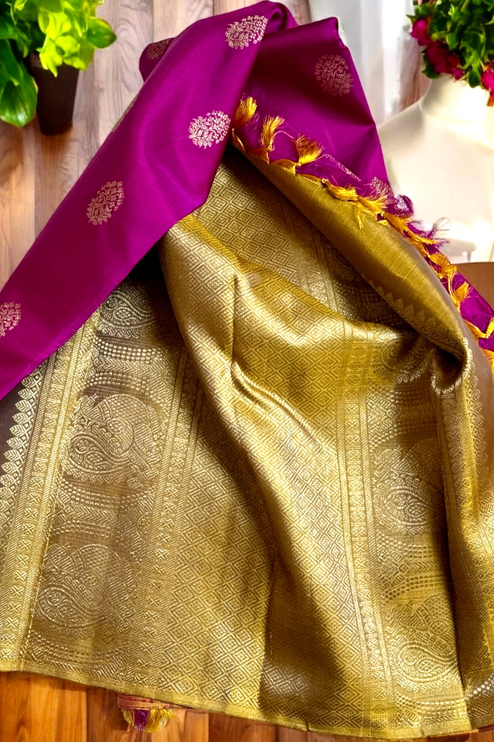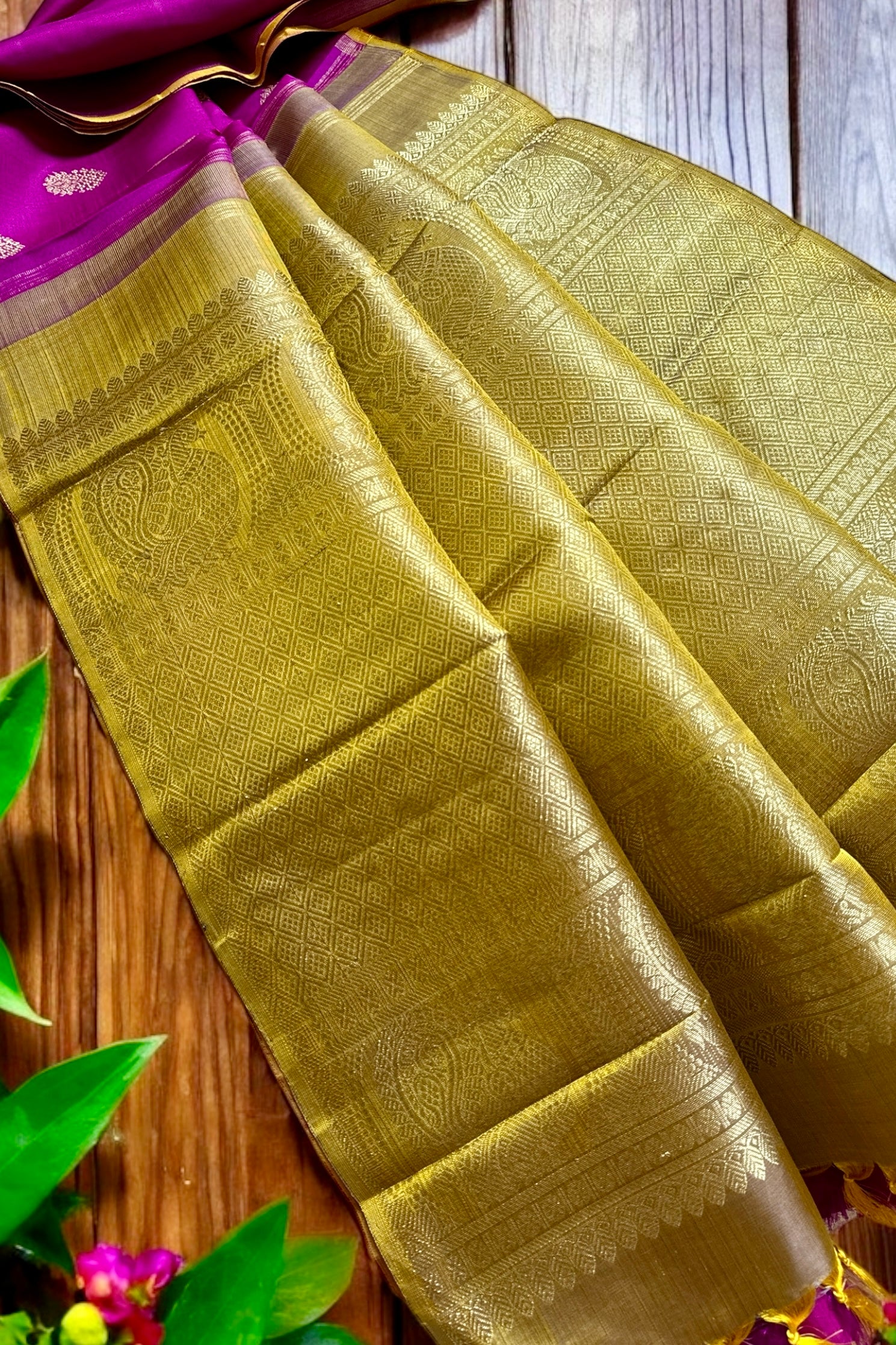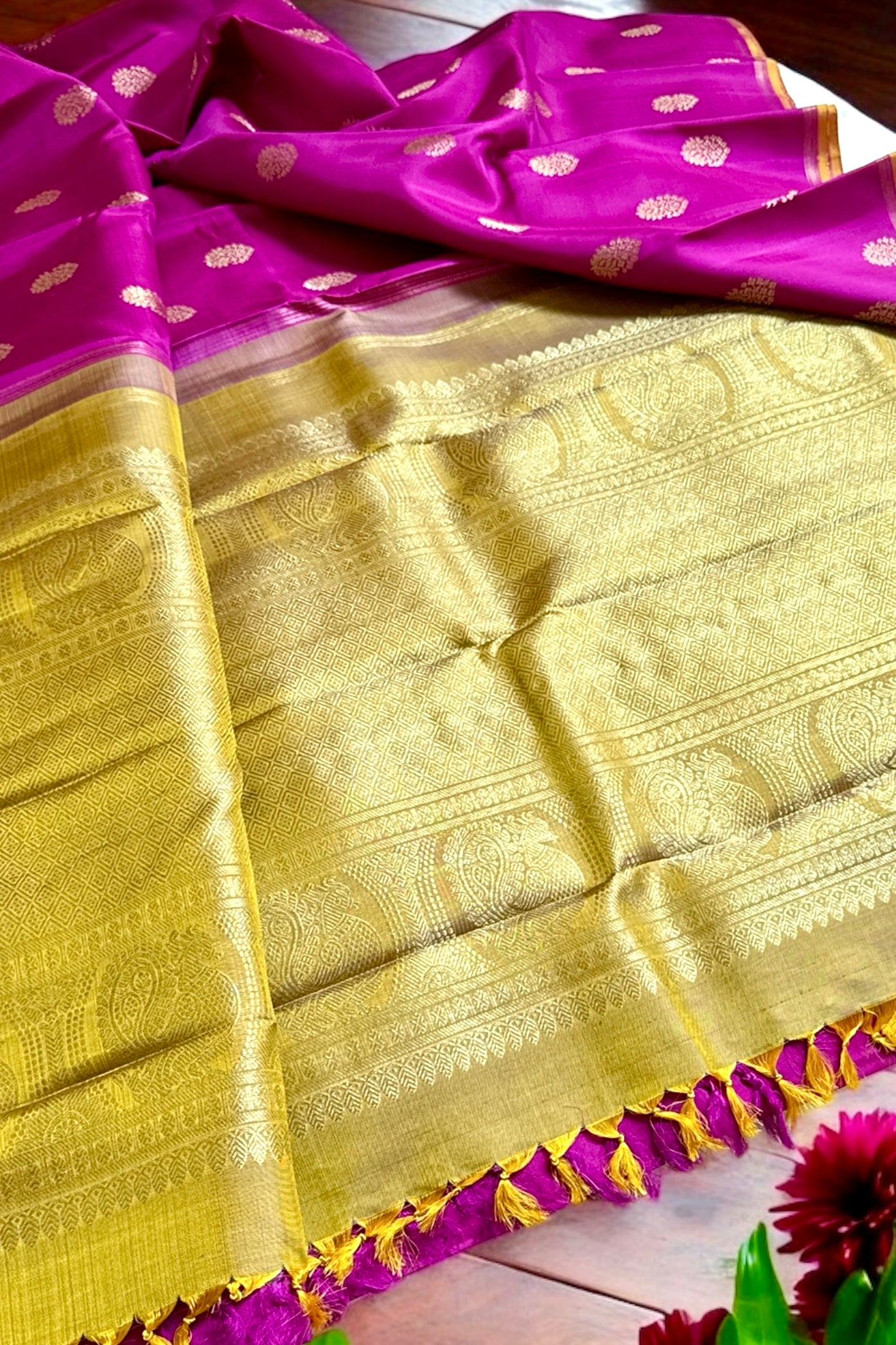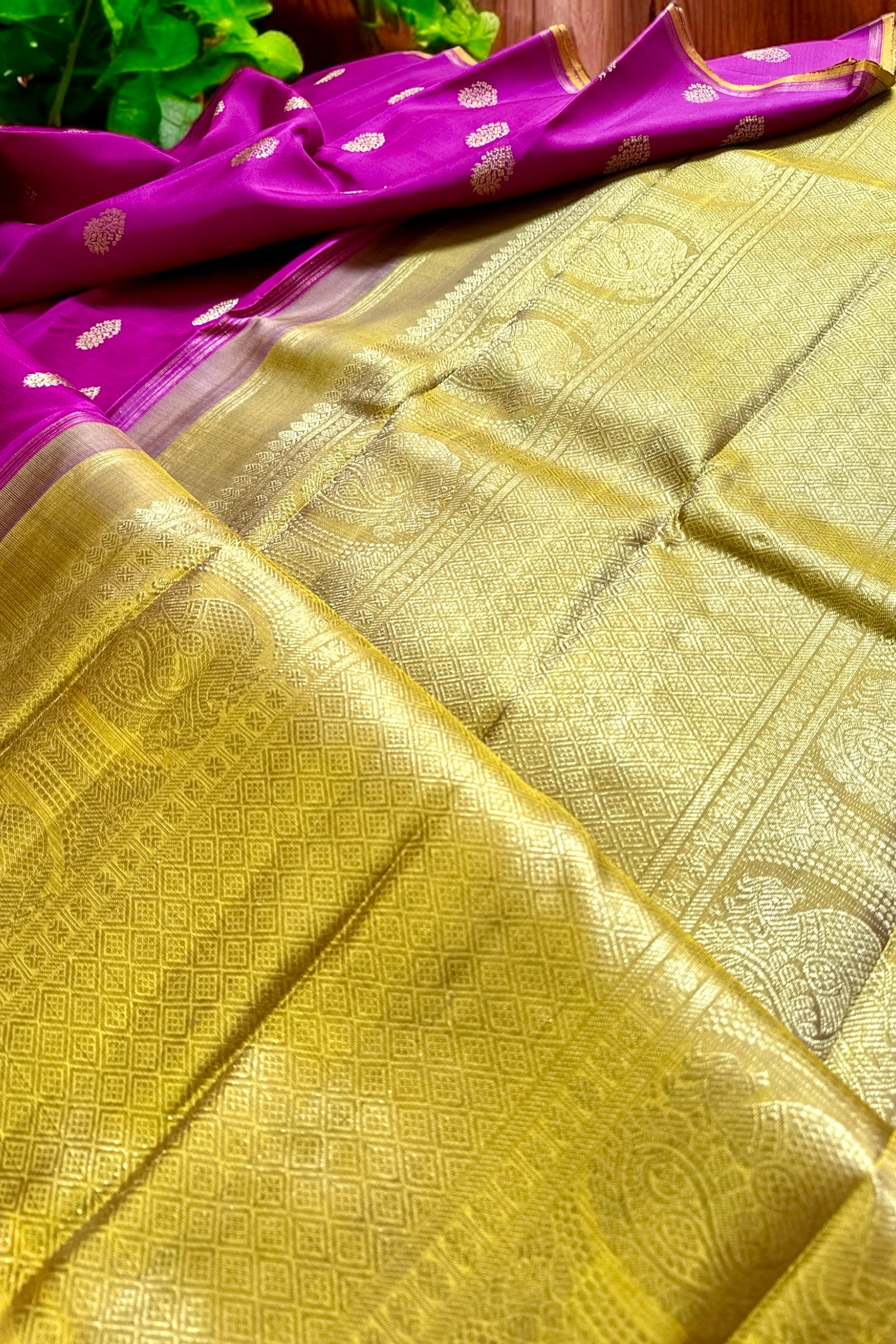 This exquisite, borderless Kanjivaram silk saree, with floral motifs on the body and a mustard green color rgand pallu, exudes elegance in its design. Handcrafted with traditional techniques, this saree is perfect for adding a touch of sophistication to any occasion.