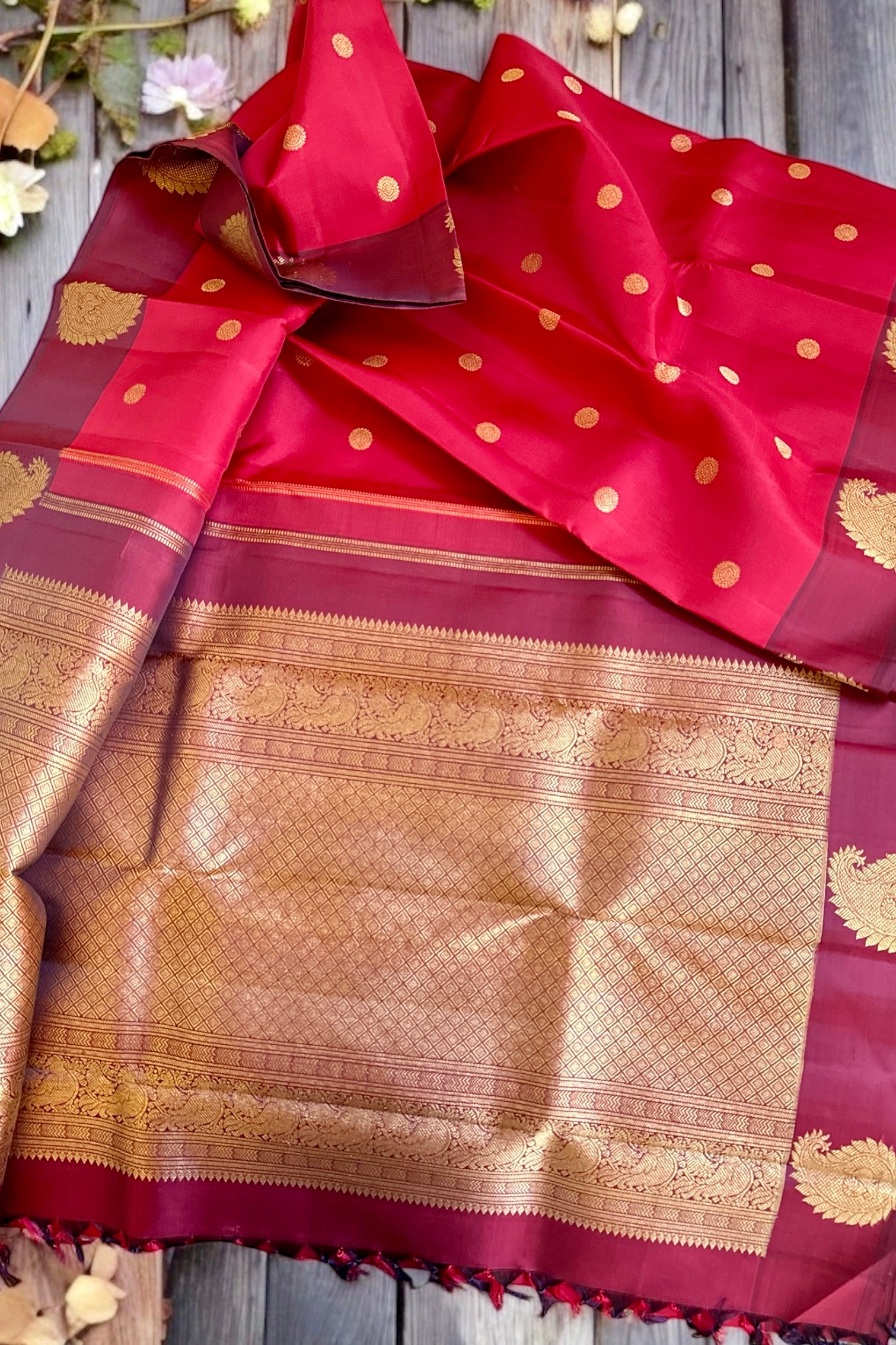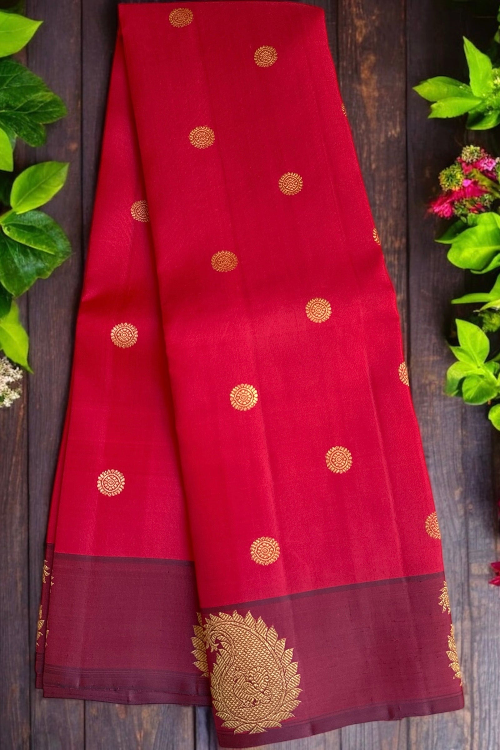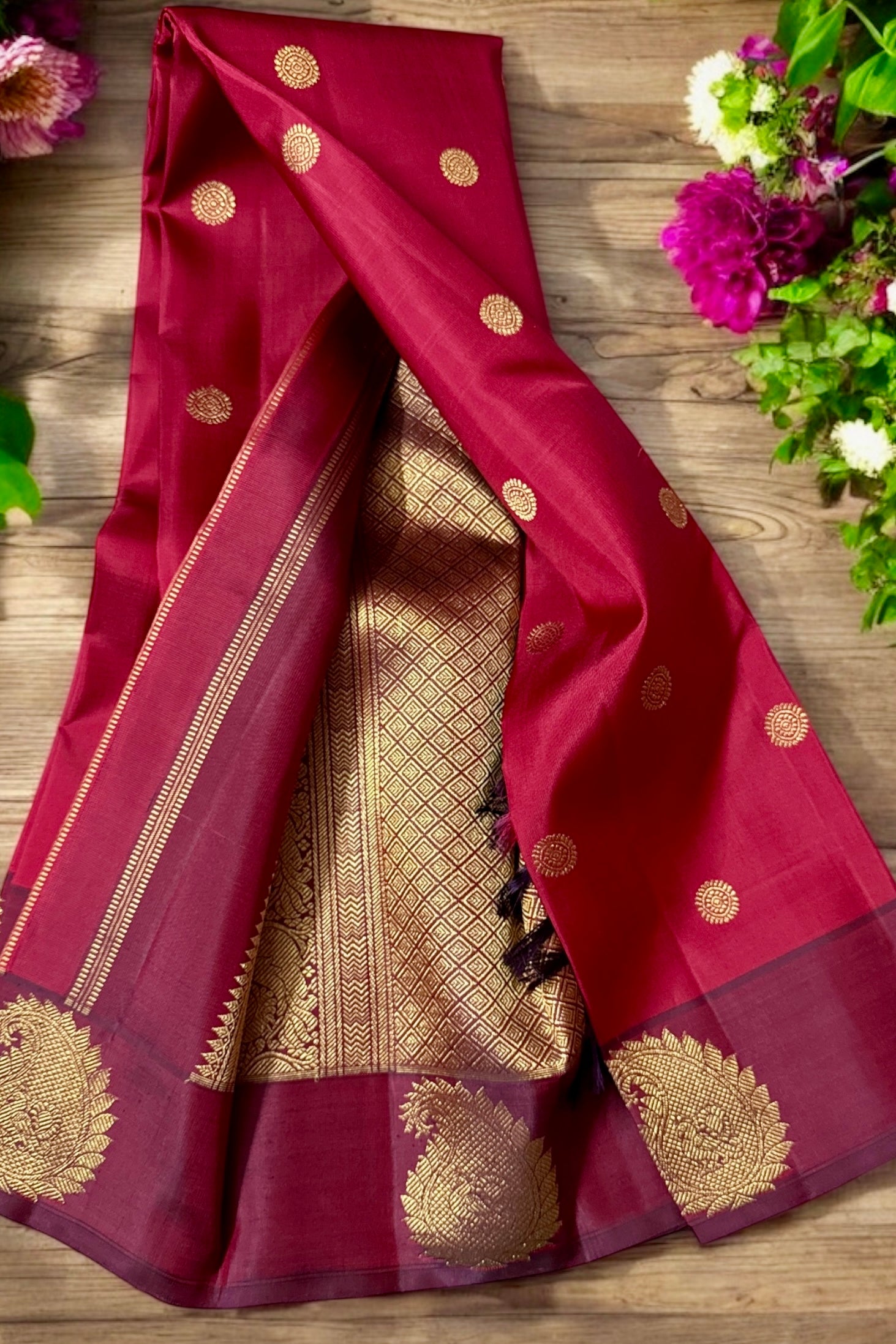 This elegant kanjivaram saree in deep burgundy shot with red is handwoven with floral buttas in gold zari, adorning the body. The borders in deep burgandy shot with black have annam enclosed in paisley motifs in gold zari. The grand pallu in the same color as the border features traditional patterns in gold zari.