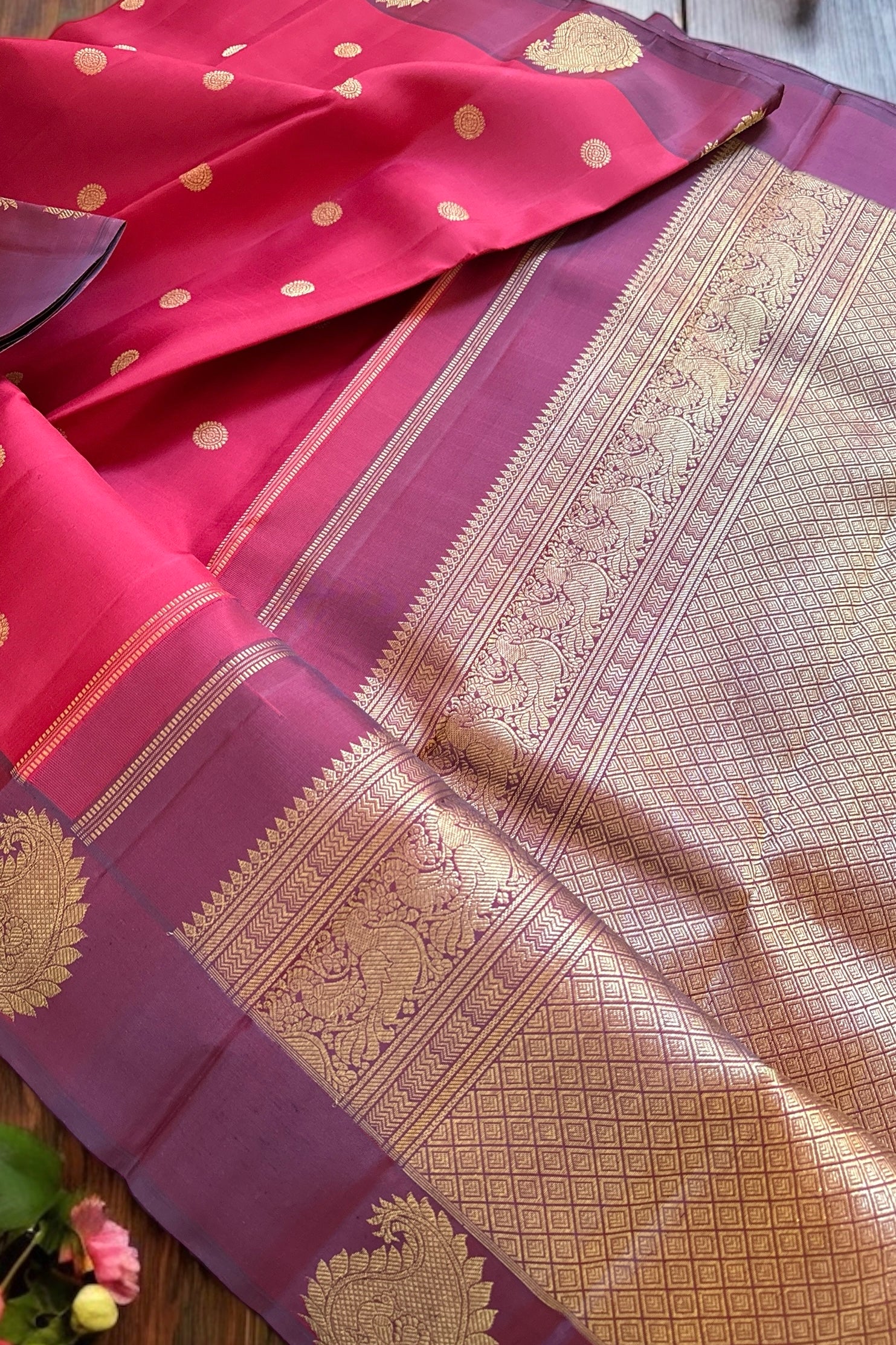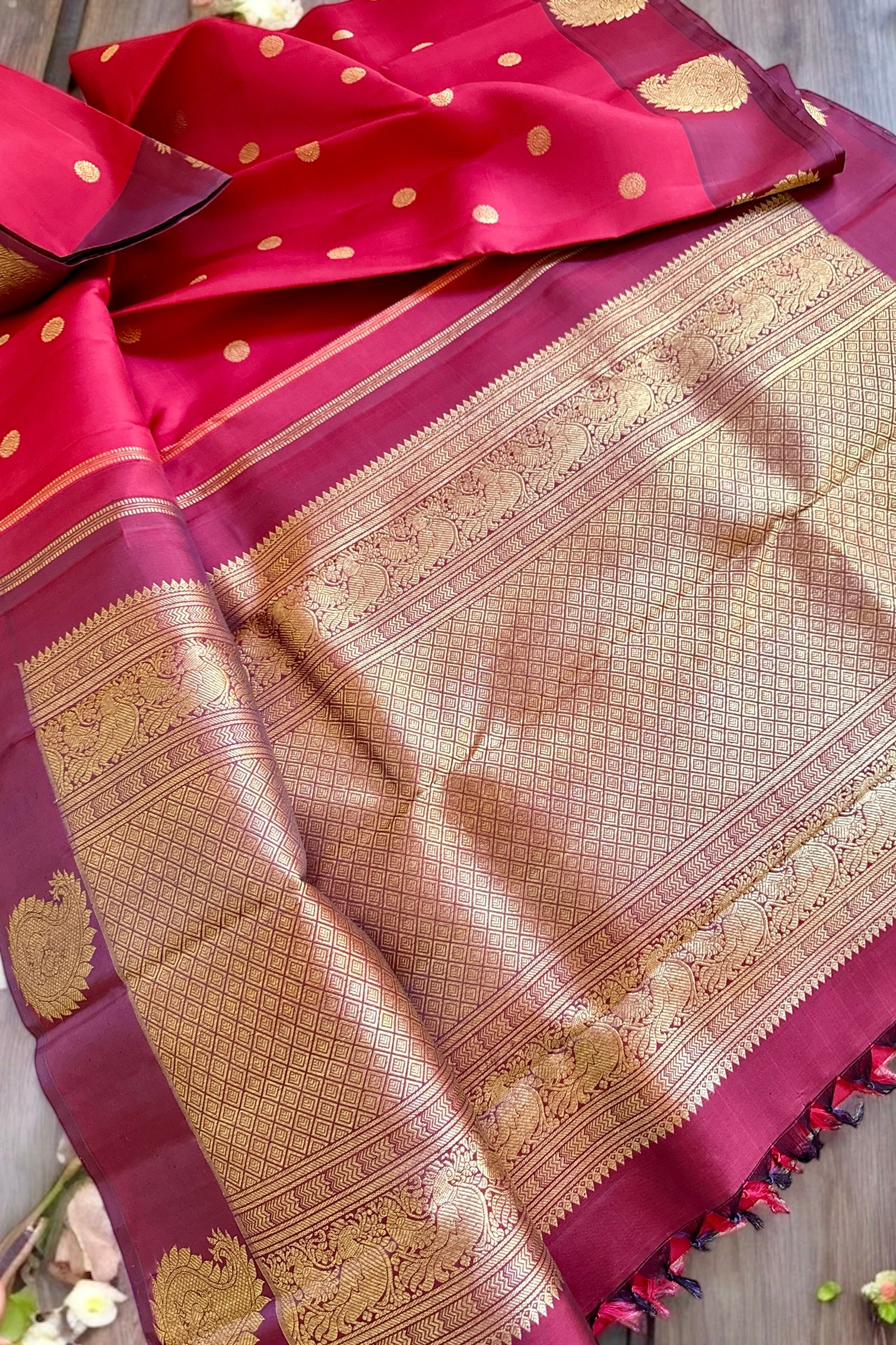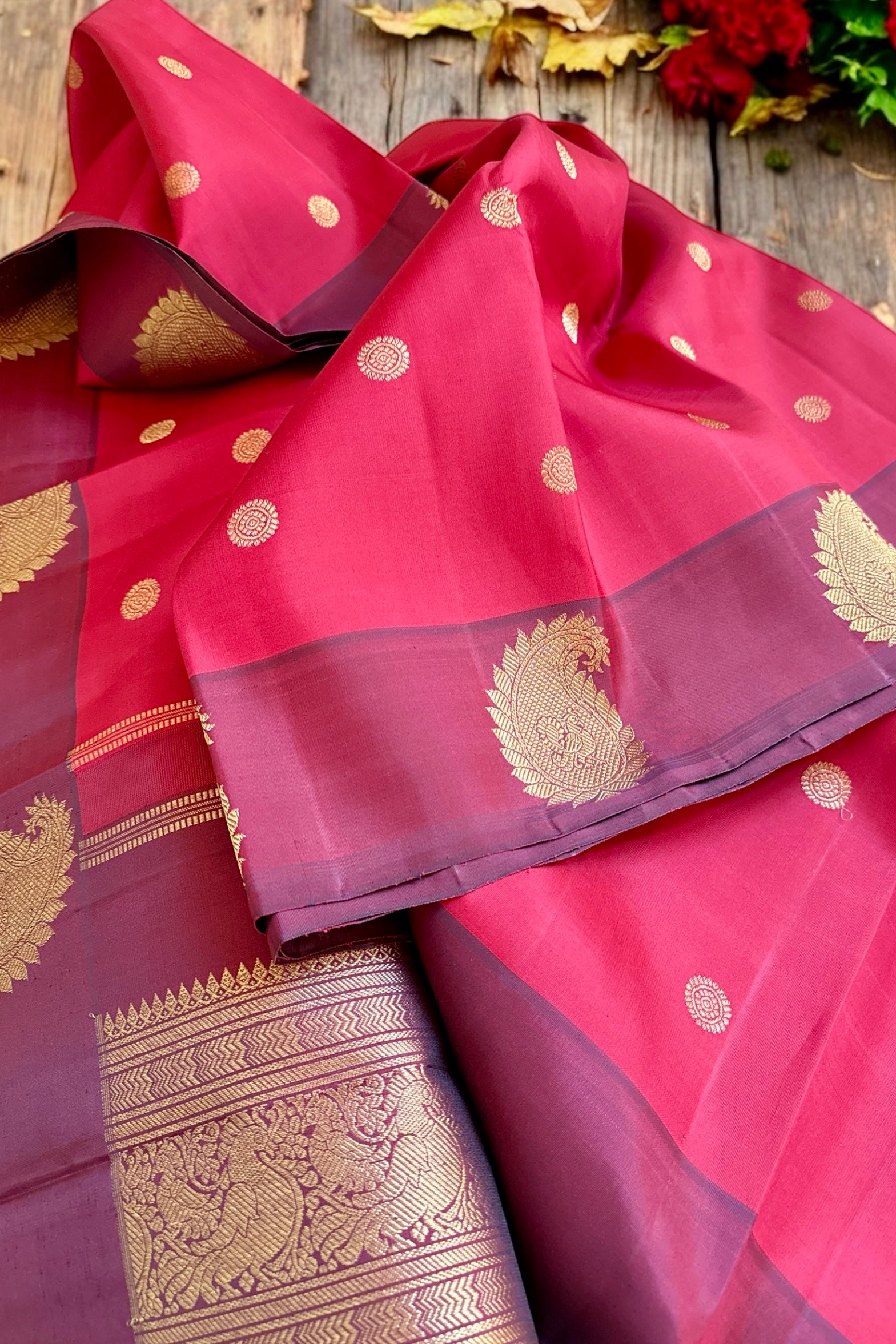 This elegant kanjivaram saree in deep burgundy shot with red is handwoven with floral buttas in gold zari, adorning the body. The borders in deep burgandy shot with black have annam enclosed in paisley motifs in gold zari. The grand pallu in the same color as the border features traditional patterns in gold zari.