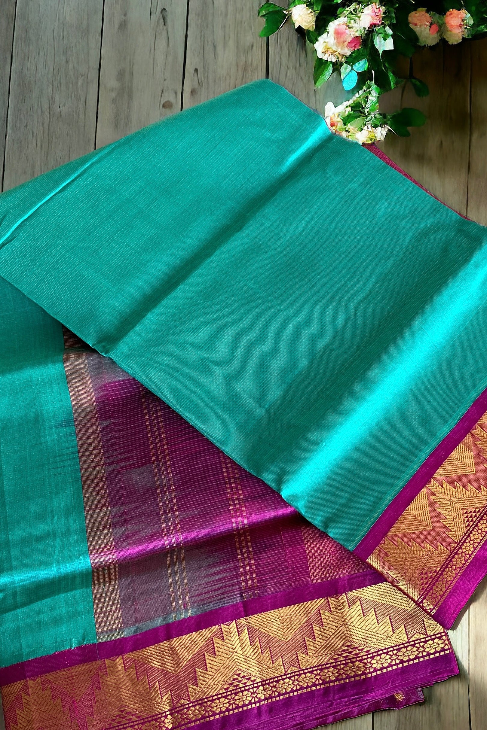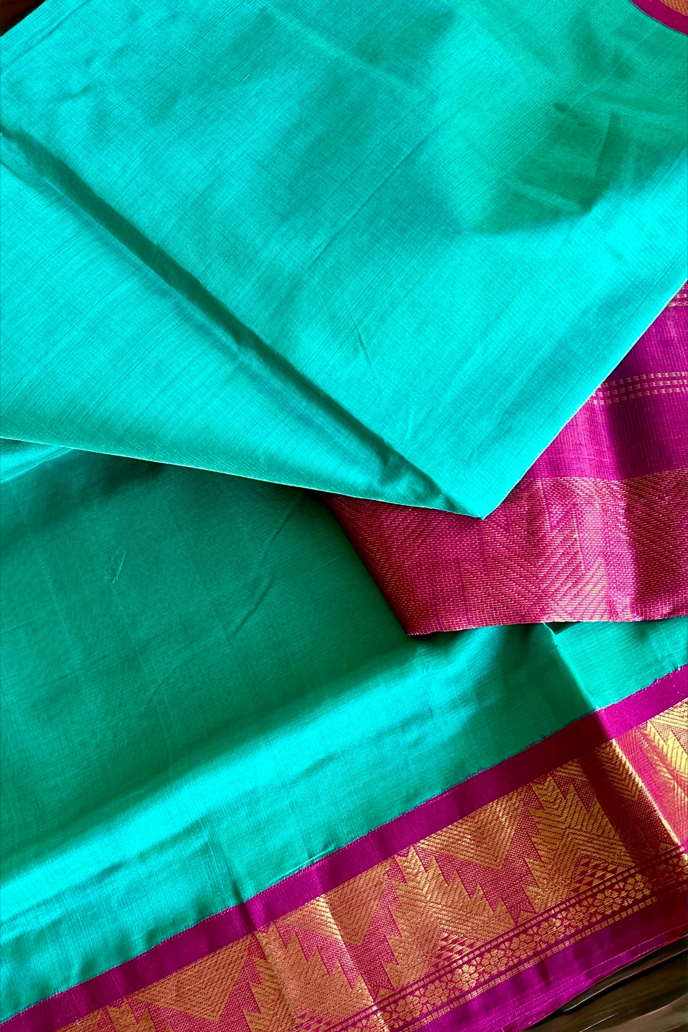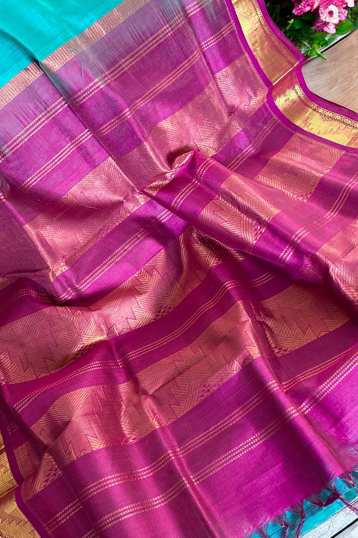 This stunning handwoven korvai silk cotton saree, in a gorgeous turquoise blue color and traditional vaira oosi (diamond pin stripe weave) pattern. Experience the ultimate in comfort and style with this exquisite saree.